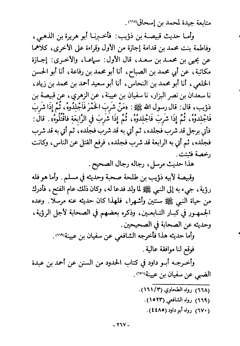 وأما حديث قبيصة بن ذؤيب: فأخبرنا أبو هريرة بن الذهبي، وفاطمة بنت محمد بن قدامة إجازة من الأول وقراءة على الأخرى، كلاهما عن يحيى بن محمد بن سعد، قال الأول: سماعا، والأخرى: إجازة مكاتبة، عن أبي محمد بن الصباح، أنا أبو محمد بن رفاعة، أنا أبو الحسن الخلعي، أنا أبو محمد بن النحاس، أنا أبو سعيد أحمد بن محمد بن زياد، نا سعدان بن نصر البزار، نا سفيان بن عيينة، عن الزهري، عن قبيصة بن ذؤيب، قال: قال رسول اللَّه -صلى اللَّه عليه وسلم-: "مَنْ شرِبَ الخَمْرَ فَاجْلِدُوهُ، ثُمَّ إِذَا شَرِبَ فَاجْلِدوُهُ، ثُمَّ إِذَا شَرِبَ فَاجْلِدوُهُ، ثُمَّ إِذَا شَرِبَ في الرَّابعَةِ فاقْتُلُوهُ". قال: فأتي برجل قد شرب فجلده، ثم أتي به قد شرب فجلده، ثم أتي به قد شرب فجلده، ثم أتي به الرابعة قد شرب فجلده، فرفع القتل عن الناس، وكانت رخصة فثبتت.