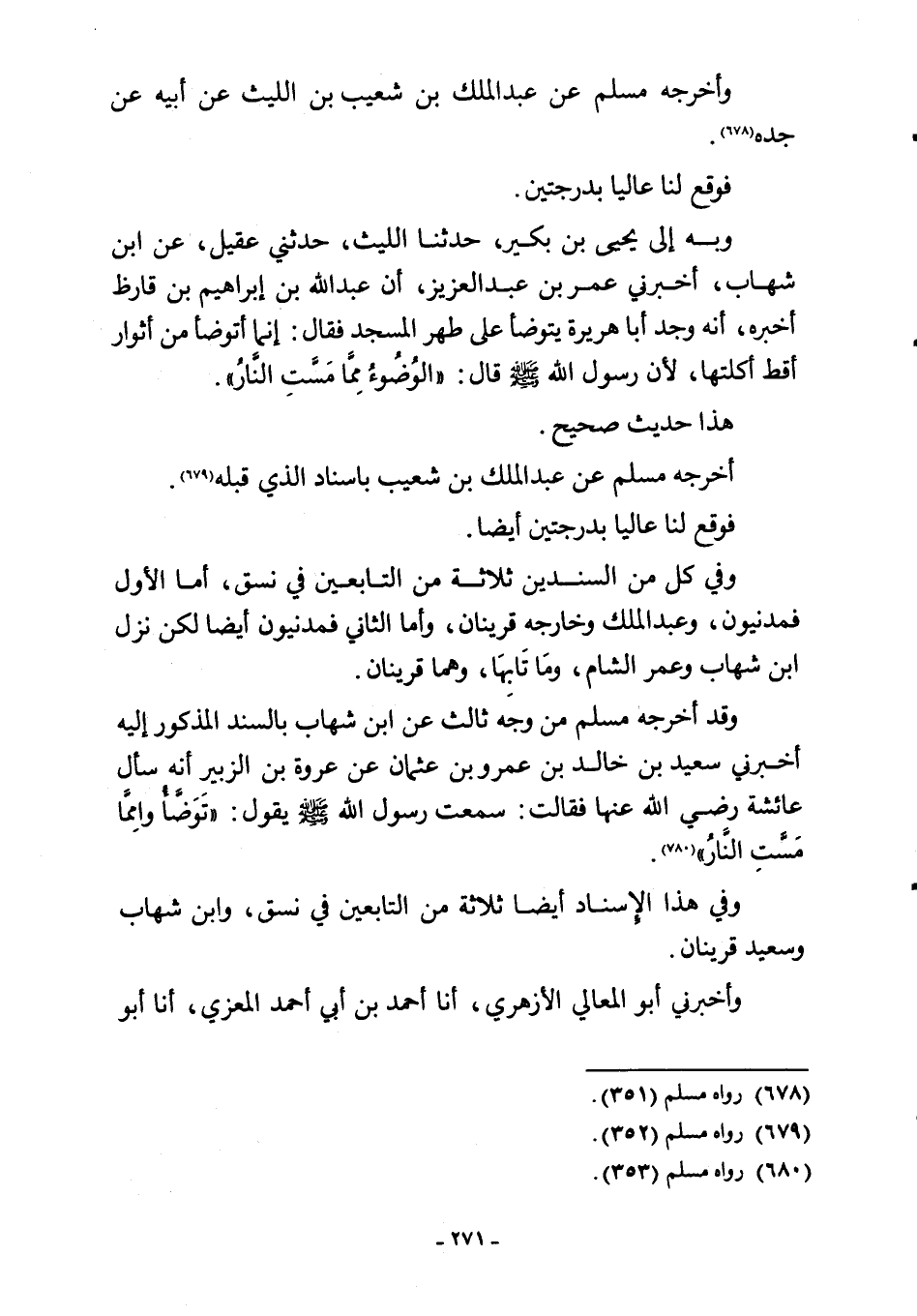 وبه إلى يحيى بن بكير، حدثنا الليث، حدثني عقيل، عن ابن شهاب، أخبرني عمر بن عبد العزيز، أن عبد اللَّه بن إبراهيم بن قارظ أخبره، أنه وجد أبا هريرة يتوضأ على طهر المسجد فقال: إنما أتوضا من أثوار أقط أكلتها، لأن رسول اللَّه -صلى اللَّه عليه وسلم- قال: "الوُضُوءُ مِمَّا مَسَّتِ النَّارُ".