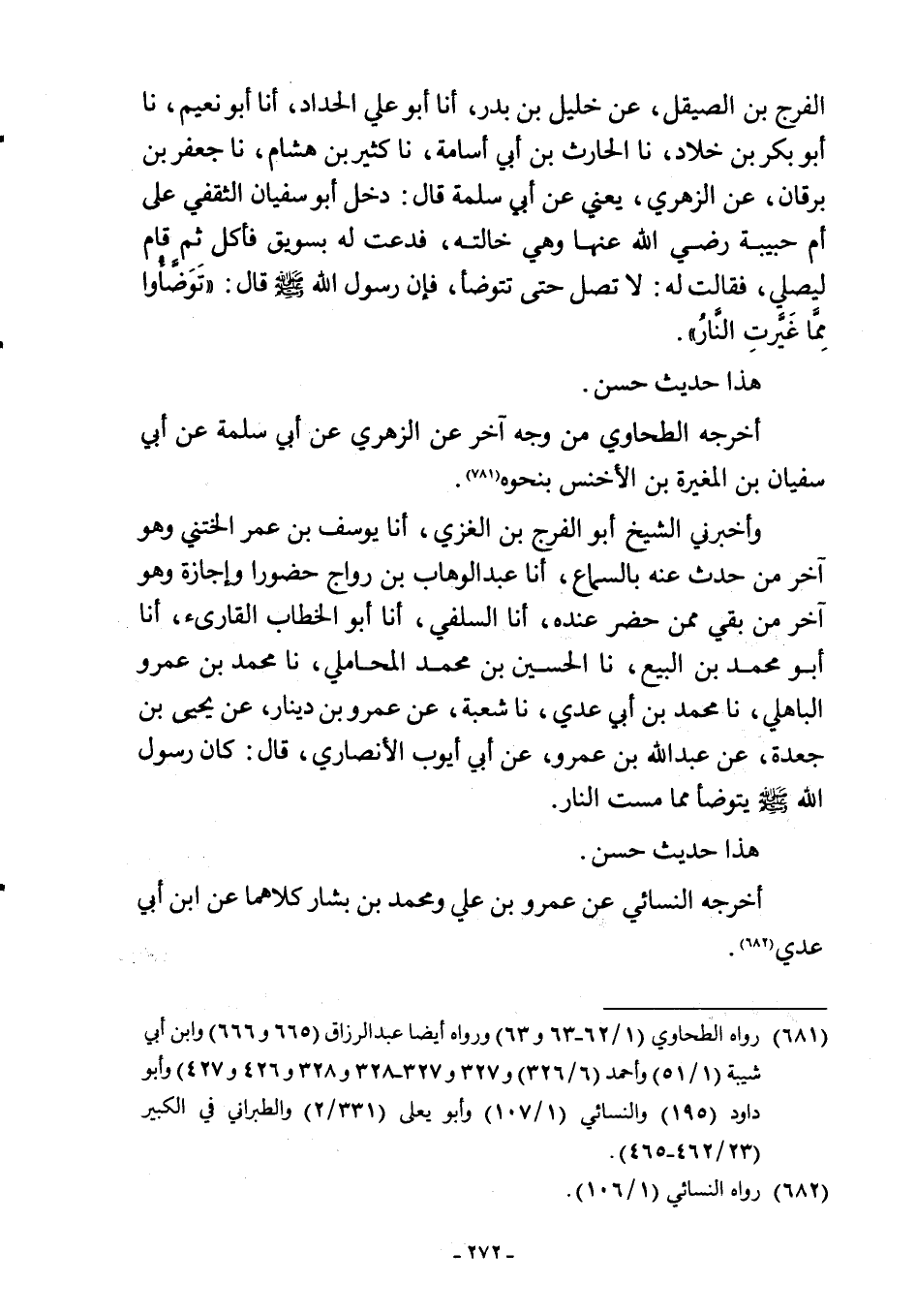 الفرج بن الصيقل، عن خليل بن بدر، أنا أبو علي الحداد، أنا أبو نعيم، نا أبو بكر بن خلاد، نا الحارث بن أبي أسامة، نا كثير بن هشام، نا جعفر بن برقان، عن الزهري، يعني عن أبي سلمة قال: دخل أبو سفيان الثقفي على أم حبيبة رضي اللَّه عنها وهي خالته، فدعت له بسويق فأكل ثم قام ليصلي، فقالت له: لا تصل حتى تتوضأ، فإن رسول اللَّه -صلى اللَّه عليه وسلم- قال: "تَوَضَّأُوا مِمَّا غَيَّرتِ النَّارُ".