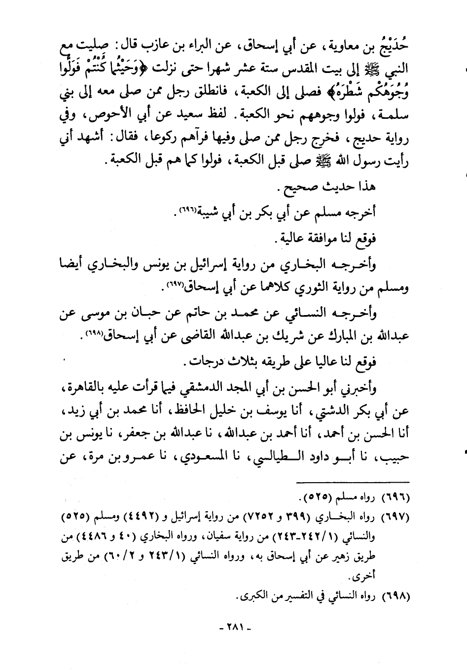حُدَيْجُ بن معاوية، عن أبي إسحاق، عن البراء بن عازب قال: صليت مع النبي -صلى اللَّه عليه وسلم- إلى بيت المقدس ستة عشر شهرا حتى نزلت {وَحَيْثُ مَا كُنْتُمْ فَوَلُّوا وُجُوهَكُمْ شَطْرَهُ} فصلى إلى الكعبة، فانطلق رجل ممن صلى معه إلى بني سلمة، فولوا وجوههم نحو الكعبة. لفظ سعيد عن أبي الأحوص، وفي رواية حديج، فخرج رجل ممن صلى وفيها فرآهم ركوعا، فقال: أشهد أني رأيت رسول اللَّه -صلى اللَّه عليه وسلم- صلى قبل الكعبة، فولوا كما هم قبل الكعبة.