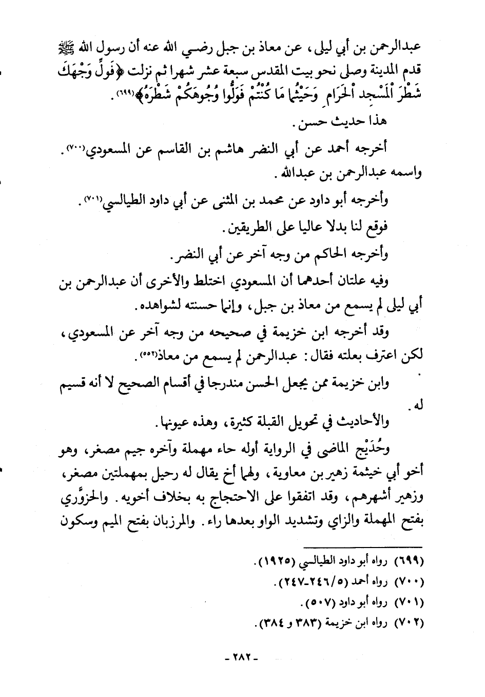 وقد أخرجه ابن خزيمة في صحيحه من وجه آخر عن المسعودي، لكن اعترف بعلته فقال: عبد الرحمن لم يسمع من معاذ (¬702).