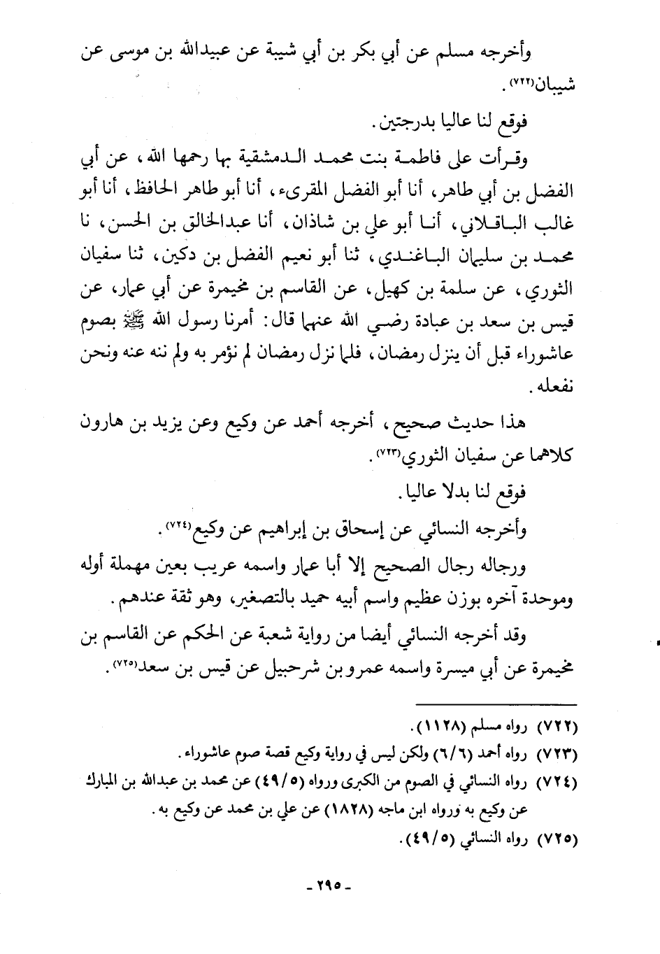 وقرأت على فاطمة بنت محمد الدمشقية بها رحمها اللَّه، عن أبي الفضل بن أبي طاهر، أنا أبو الفضل المقرئ، أنا أبو طاهر الحافظ، أنا أبو غالب الباقلاني، أنا أبو علي بن شاذان، أنا عبد الخالق بن الحسن، نا محمد بن سليمان الباغندي، ثنا أبو نعيم الفضل بن دكين، ثنا سفيان الثوري، عن سلمة بن كهيل، عن القاسم بن مخيمرة عن أبي عمار، عن قيس بن سعد بن عبادة -رضي اللَّه عنهما- قال: أمرنا رسول اللَّه -صلى اللَّه عليه وسلم- بصوم عاشوراء قبل أن ينزل رمضان، فلما نزل رمضان لم نؤمر به ولم ننه عنه ونحن نفعله.