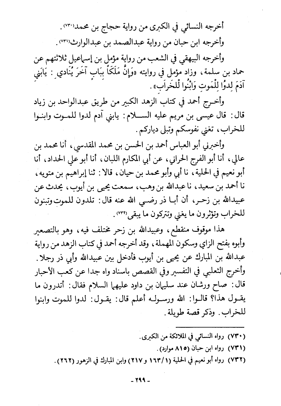 وأخرجه البيهقي في الشعب من رواية مؤمل بن إسماعيل ثلاثتهم عن حماد بن سلمة، وزاد مؤمل في روايته "وَإِنَّ مَلَكًا بِبَابٍ آخَرَ يُنَادي: يَا بَنِي آدَمَ لِدوُا لِلْمَوتِ وَابْنُوا لْلخَرابِ".