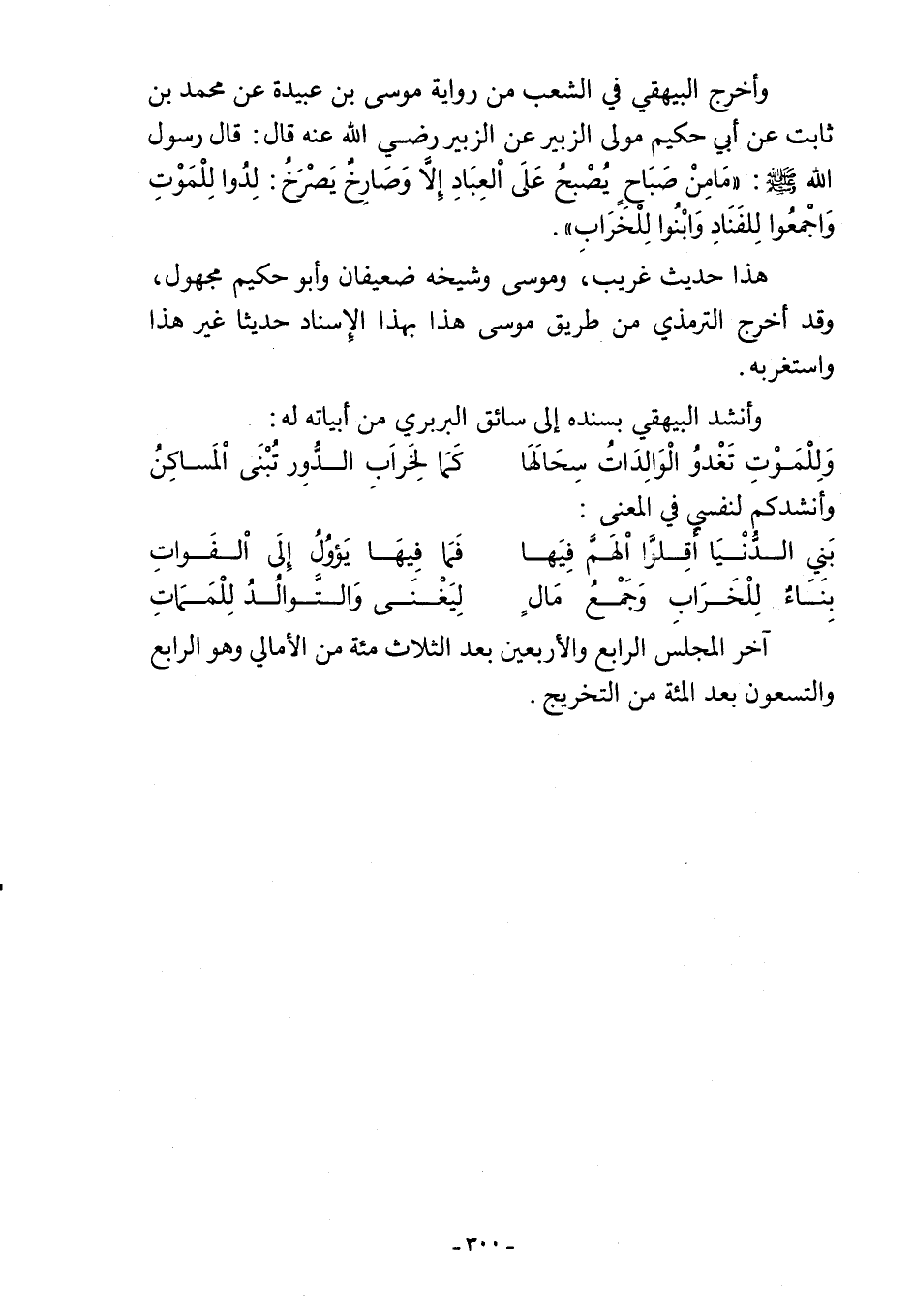 وأخرج البيهقي في الشعب من رواية موسى بن عبيدة عن محمد بن ثابت عن أبي حكيم مولى الزبير عن الزبير -رضي اللَّه عنه- قال: قال رسول اللَّه -صلى اللَّه عليه وسلم-: "مَا مِنْ صَبَاحٍ يُصْبحُ عَلَى العِبَادِ إِلَّا وَصَارِخٌ يَصْرَخُ: لِدُوا لِلْمَوْتِ وَاجْمعُوا لِلفَنَادِ وَابْنُوا لِلْخَرَابِ".