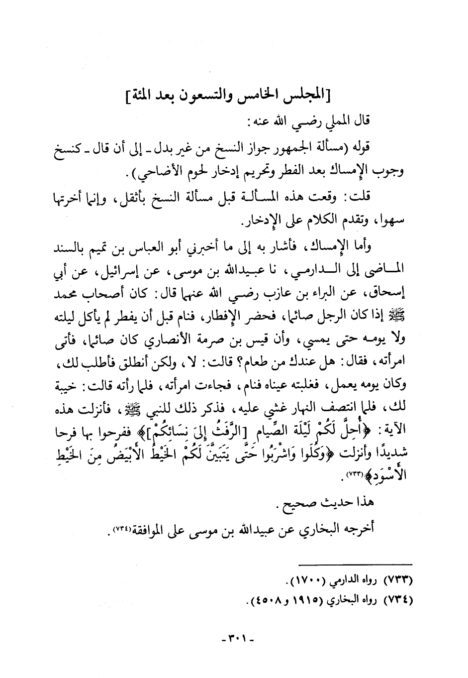 وأما الإِمساك، فأشار به إلى ما أخبرني أبو العباس بن تميم بالسند الماضى إلى الدارمي، نا عبيد اللَّه بن موسى، عن إسرائيل، عن أبي إسحاق، عن البراء بن عازب -رضي اللَّه عنهما- قال: كان أصحاب محمد -صلى اللَّه عليه وسلم- إذا كان الرجل صائما، فحضر الإِفطار، فنام قبل أن يفطر لم يأكل ليلته ولا يومه حتى يمسي، وأن قيس بن صرمة الأنصاري كان صائما، فأتى امرأته، فقال: هل عندك من طعام؟ قالت: لا، ولكن أنطلق فأطلب لك، وكان يومه يعمل، فغلبته عيناه فنام، فجاءت امرأته، فلما رأته قالت: خيبة لك، فلما انتصف النهار غشي عليه، فذكر ذلك للنبي -صلى اللَّه عليه وسلم-، فأنزلت هذه الآية: {أُحِلَّ لَكُمْ لَيْلَةَ الصِّيَامِ [الرَّفَثُ إِلَى نِسَائِكُمْ]} ففرحوا بها فرحا شديدًا وأنزلت {وَكُلُوا وَاشْرَبُوا حَتَّى يَتَبَيَّنَ لَكُمُ الْخَيْطُ الْأَبْيَضُ مِنَ الْخَيْطِ الْأَسْوَدِ} (¬733).