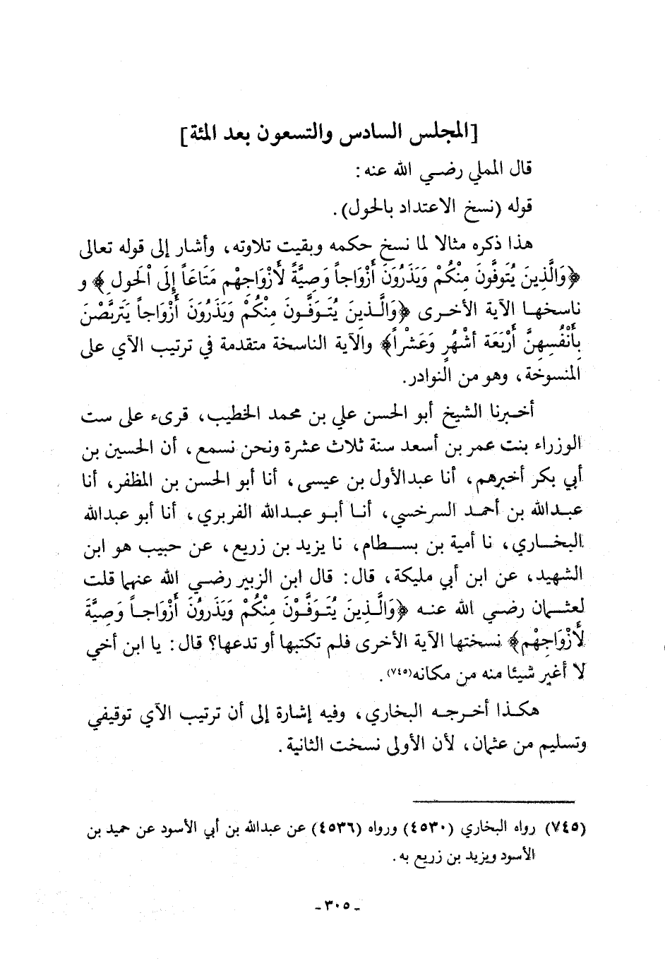 أخبرنا الشيخ أبو الحسن علي بن محمد الخطيب، قرئ على ست الوزراء بنت عمر بن أسعد سنة ثلاث عشرة ونحن نسمع، أن الحسين بن أبي بكر أخيرهم، أنا عبد الأول بن عيسى، أنا أبو الحسن بن المظفر، أنا عبد اللَّه بن أحمد السرخسي، أنا أبو عبد اللَّه الفربري، أنا أبو عبد اللَّه البخاري، نا أمية بن بسطام، نا يزيد بن زريع، عن حبيب هو ابن الشهيد، عن ابن أبي مليكة، قال: قال ابن الزبير -رضي اللَّه عنهما- قلت لعثمان -رضي اللَّه عنه- {وَالَّذِينَ يُتَوَفَّوْنَ مِنْكُمْ وَيَذَرُونَ أَزْوَاجًا وَصِيَّةً لِأَزْوَاجِهِمْ} نسختها الآية الأخرى فلم تكتبها أو تدعها؟ قال: يا ابن أخي لا أغير شيئا منه من مكانه (¬745).