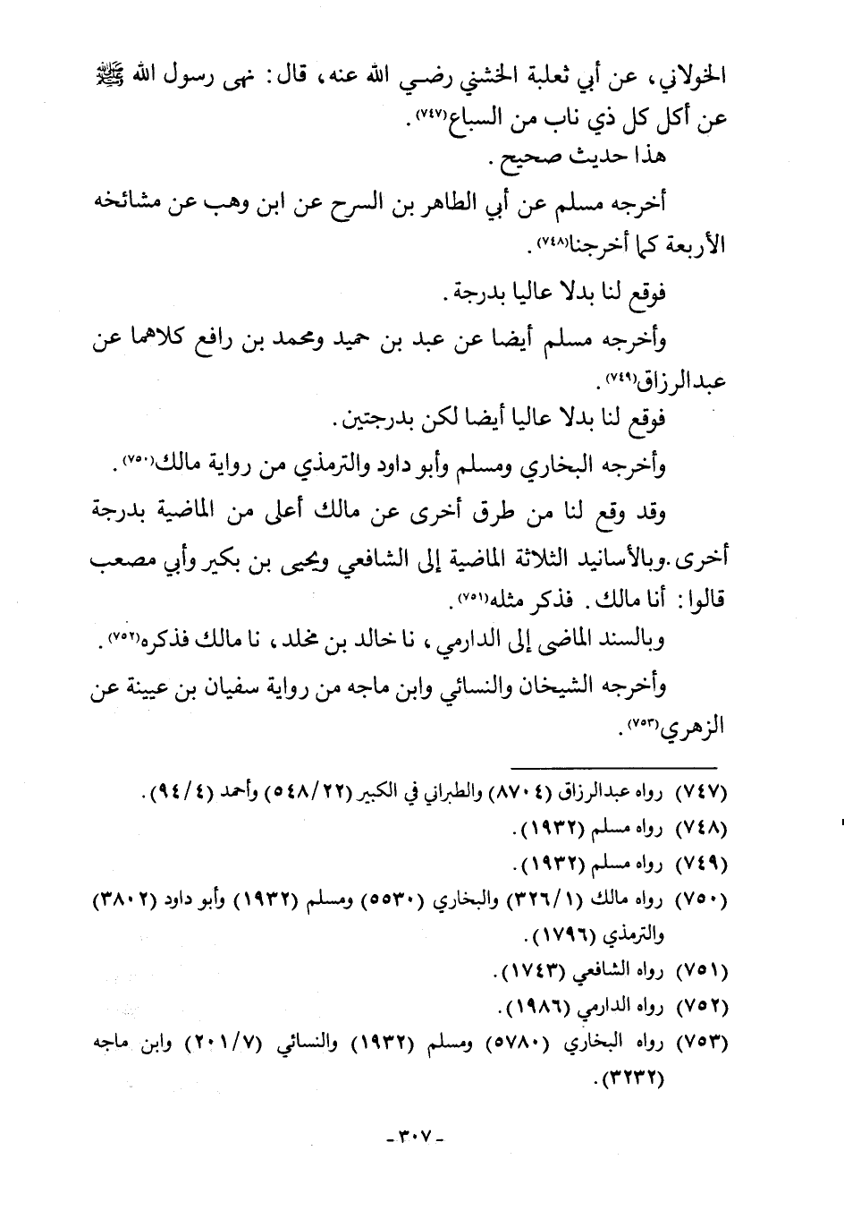 الخولاني، عن أبي ثعلبة الخشني -رضي اللَّه عنه-، قال: نهى رسول اللَّه -صلى اللَّه عليه وسلم- عن أكل كل ذي ناب من السباع (¬747).
