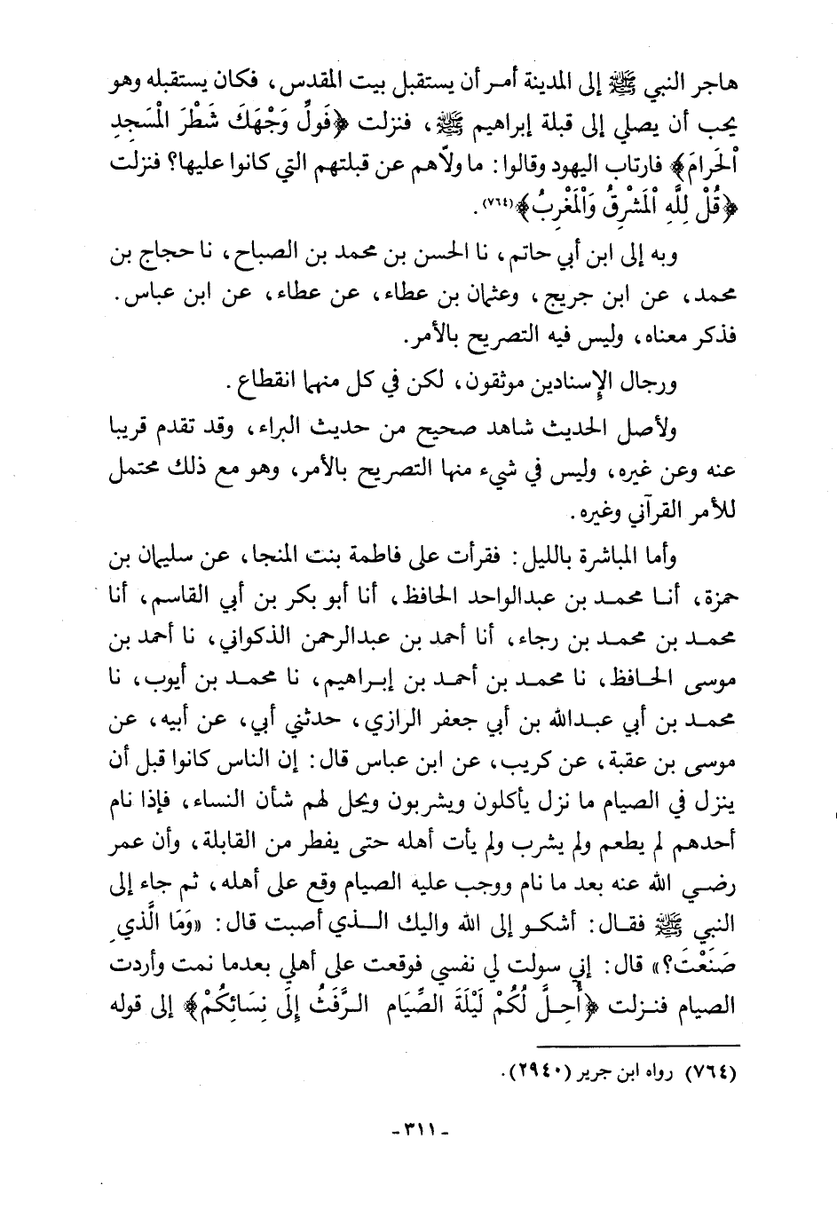 وأما المباشرة بالليل: فقرأت على فاطمة بنت المنجا، عن سليمان بن حمزة، أنا محمد بن عبد الواحد الحافظ، أنا أبو بكر بن أبي القاسم، أنا محمد بن محمد بن رجاء، أنا أحمد بن عبد الرحمن الذكواني، نا أحمد بن موسى الحافظ، نا محمد بن أحمد بن إبراهيم، نا محمد بن أيوب، نا محمد بن أبي عبد اللَّه بن أبي جعفر الرازي، حدثني أبي، عن أبيه، عن موسى بن عقبة، عن كريب، عن ابن عباس قال: إن الناس كانوا قبل أن ينزل في الصيام ما نزل يأكلون ويشربون ويحل لهم شأن النساء، فإذا نام أحدهم لم يطعم ولم يشرب ولم يأت أهله حتى يفطر من القابلة، وأن عمر -رضي اللَّه عنه- بعدما نام ووجب عليه الصيام وقع على أهله، ثم جاء إلى النبي -صلى اللَّه عليه وسلم- فقال: أشكو إلى اللَّه واليك الذي أصبت قال: "وَمَا الَّذي صَنعْتَ؟ " قال: إني سولت لي نفسي فوقعت على أهلي بعدما نمت وأردت الصيام فنزلت {أُحِلَّ لَكُمْ لَيْلَةَ الصِّيَامِ الرَّفَثُ إِلَى نِسَائِكُمْ} إلى قوله