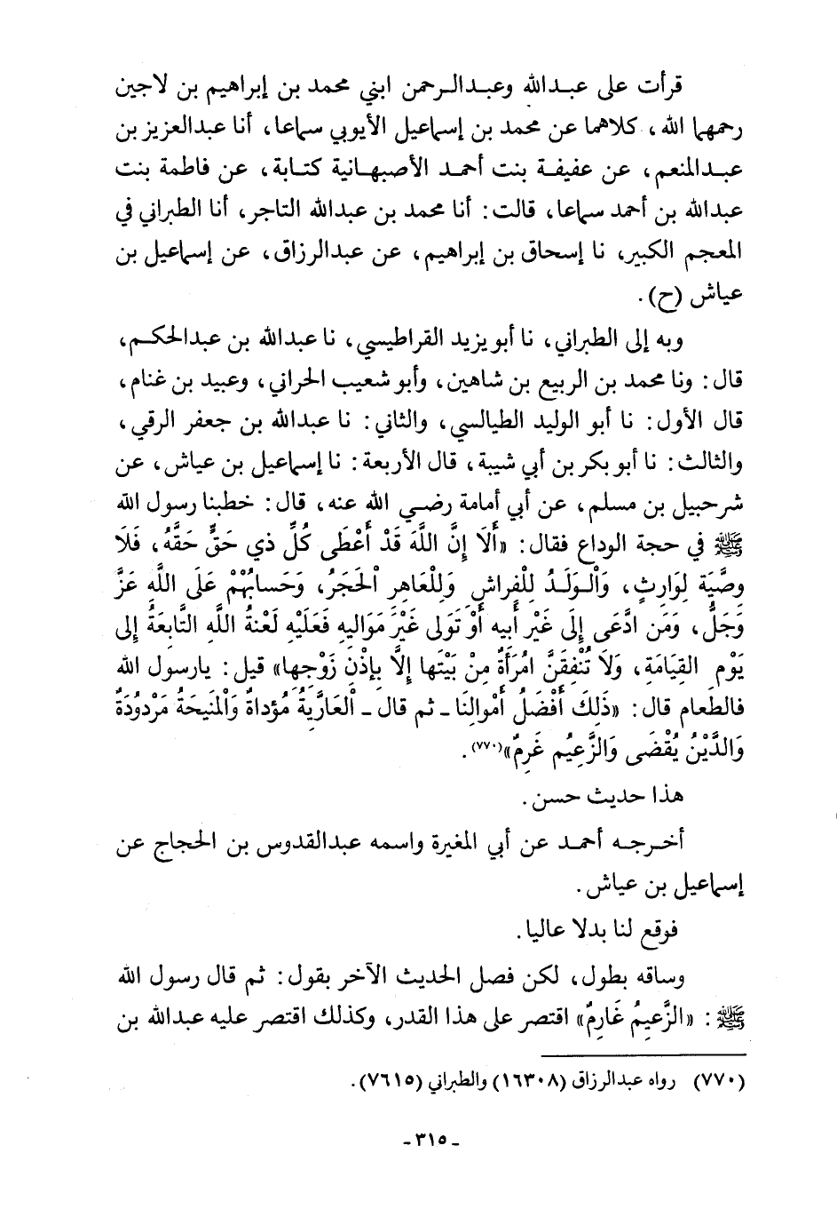 وبه إلى الطبراني، نا أبو يزيد القراطيسي، نا عبد اللَّه بن عبد الحكم، قال: ونا محمد بن الربيع بن شاهين، وأبو شعيب الحراني، وعبيد بن غنام، قال الأول: نا أبو الوليد الطيالسي، والثاني: نا عبد اللَّه بن جعفر الرقي، والثالث: نا أبو بكر بن أبي شيبة، قال الأربعة: نا إسماعيل بن عياش، عن شرحبيل بن مسلم، عن أبي أمامة -رضي اللَّه عنه-، قال: خطبنا رسول اللَّه -صلى اللَّه عليه وسلم- في حجة الوداع فقال: "ألَا إِنَّ اللَّهَ قَدْ أَعْطَى كُلِّ ذِي حَقٍّ حَقَّهُ، فَلَا وِصَّيَة لِوَارِثٍ، وَالوَلَدُ لِلْفراش وَلِلْعَاهِرِ الحَجَرُ، وَحَسَابُهْمْ عَلَى اللَّهِ عَزَّ وَجَلّ، وَمَنْ ادَّعَى إِلَى غَيْر أَبيه أَوْ تَوَلى غَيْرَ مَوَاليهِ فَعَلَيْهِ لَعْنةُ اللَّهِ التَّابِعَةُ إِلى يَوْمِ القِيَامَةِ، وَلَا تُنْفِقَنَّ امُرَأَةٌ مِنْ بَيْتَها إِلَّا بإِذْنِ زَوْجِهِا" قيل: يا رسول اللَّه فالطعام قال: "ذَلِكَ أَفْضَلُ أَمْوالِنَا -ثم قال- العَارَّيةُ مُؤداةٌ وَالمَنَيحَةُ مَرْدوُدَةٌ وَالدَّيْنُ يُقْضَى وَالزَّعِيُم غَرِمٌ" (¬770).