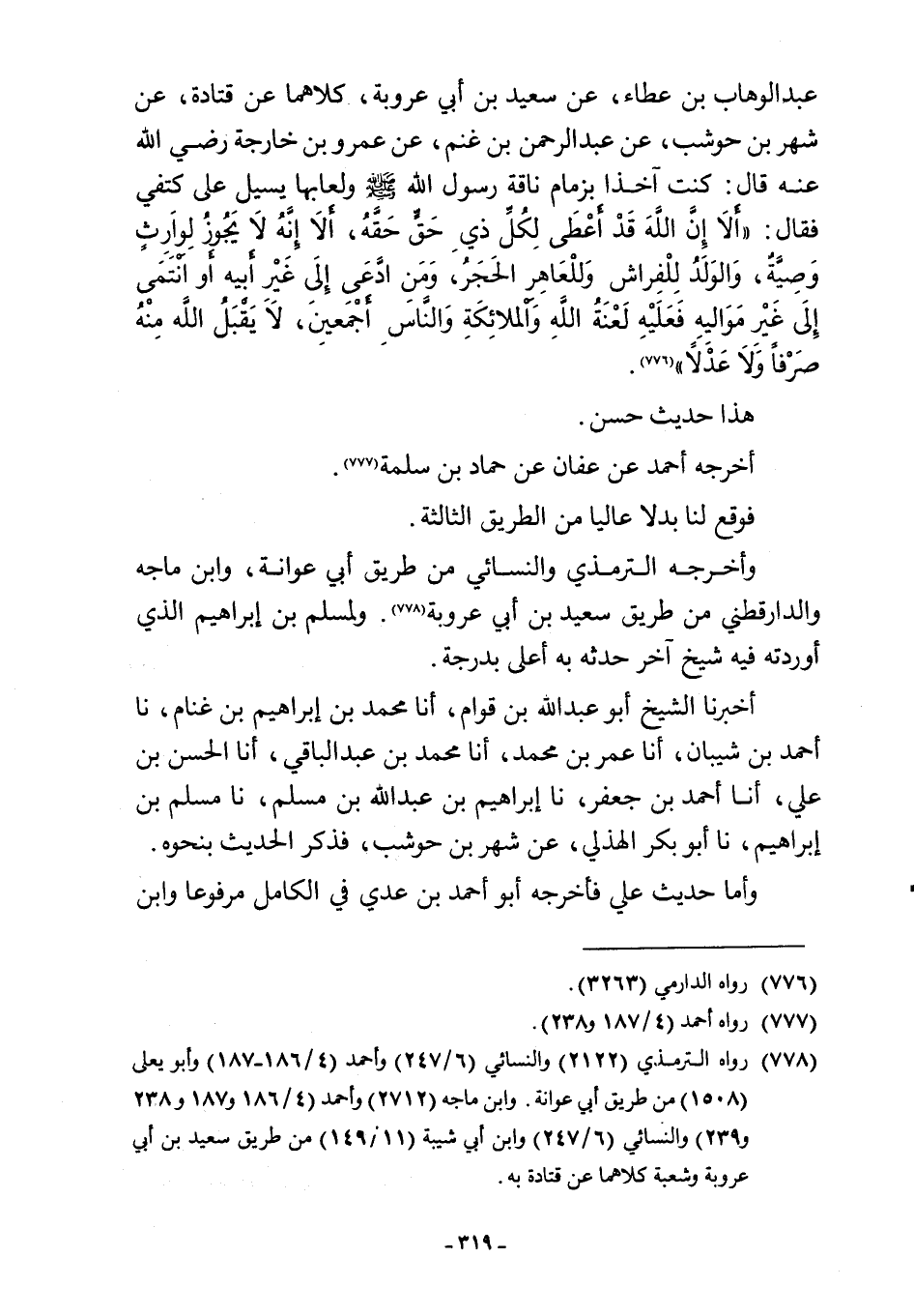 عبد الوهاب بن عطاء، عن سعيد بن أبي عروبة، كلاهما عن قتادة، عن شهر بن حوشب، عن عبد الرحمن بن غنم، عن عمرو بن خارجة -رضي اللَّه عنه- قال: كنت آخذا بزمام ناقة رسول اللَّه -صلى اللَّه عليه وسلم- ولعابها يسيل على كتفي فقال: "أَلَا إِنَّ اللَّهَ قَدْ أَعْطَى لِكُلِّ ذِي حَقٍّ حَقَّهُ، أَلَا إِنَّهُ لَا يَجُوزُ لِوَارِثٍ وَصِيَّةٌ، وَالوَلَدُ لِلْفِراش وَللْعَاهِر الحَجَرُ، وَمَنِ ادَّعَى إِلَى غَيْر أَبيه أَو انْتَمَى إِلَى غَيْر مَوَاليهِ فَعَلَيْهِ لَعْنَةُ اللَّهِ وَالْملائِكَةِ وَالنَّاسِ أَجْمَعين، لَا يَقْبَلُ اللَّه مِنْهُ صَرْفًا وَلَا عَدْلًا" (¬776).