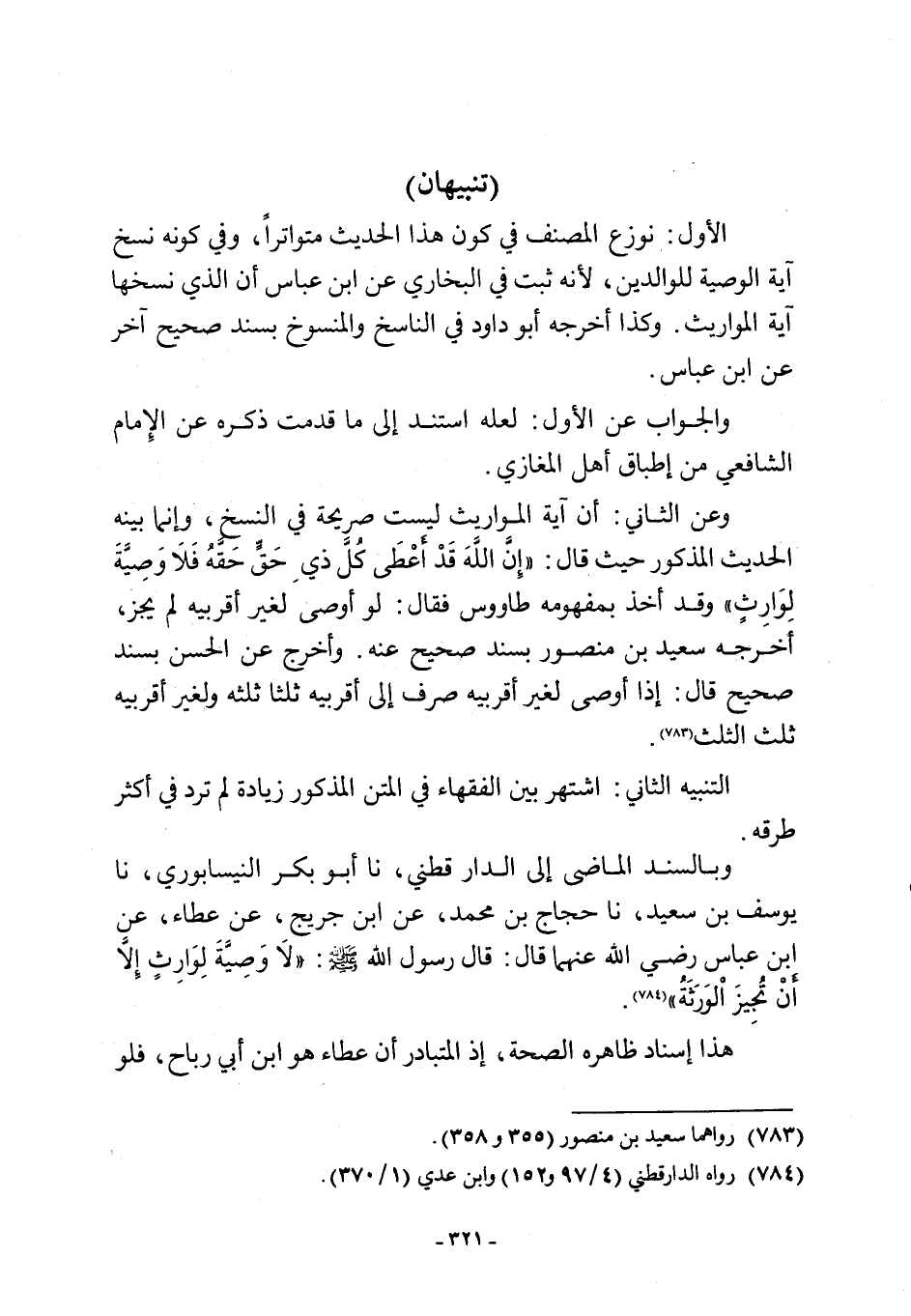 الأول: نوزع المصنف في كون هذا الحديث متواترًا، وفي كونه نسخ آية الوصية للوالدين، لأنه ثبت في البخاري عن ابن عباس أن الذي نسخها آية المواريث. وكذا أخرجه أبو داود في الناسخ والمنسوخ بسند صحيح آخر عن ابن عباس.