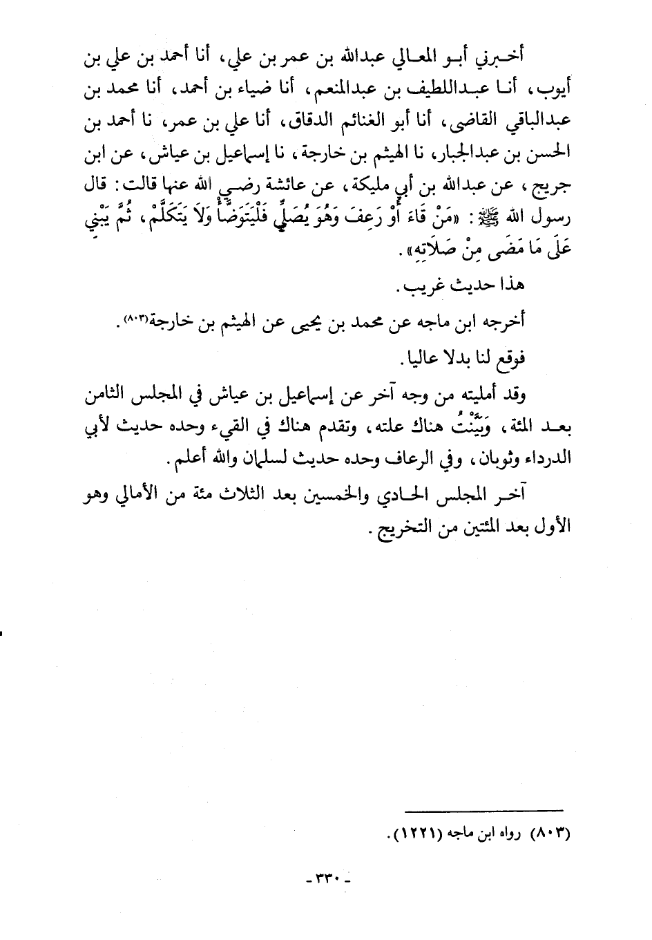 أخبرني أبو المعالي عبد اللَّه بن عمر بن علي، أنا أحمد بن علي بن أيوب، أنا عبد اللطيف بن عبد المنعم، أنا ضياء بن أحمد، أنا محمد بن عبد الباقي القاضي، أنا أبو الغنائم الدقاق، أنا علي بن عمر، نا أحمد بن الحسن بن عبد الجسار، نا الهيثم بن خارجة، نا إسماعيل بن عياش، عن ابن جريج، عن عبد اللَّه بن أبي مليكة، عن عائشة رضي اللَّه عنها قالت: قال رسول اللَّه -صلى اللَّه عليه وسلم-: "مَنْ قَاءَ أَوْ رَعِفَ وَهُوَ يُصَلِّي فَلْيَتَوَضَّأْ وَلَا يَتَكَلَّمْ، ثُمَّ يَبْنِي عَلَى مَا مَضى مِنْ صَلَاتِهِ".