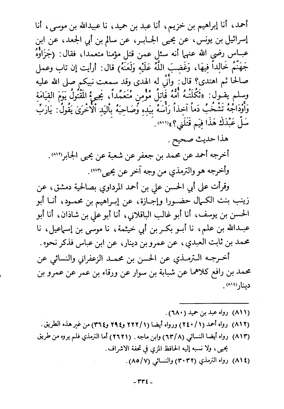 أحمد، أنا إبراهيم بن خزيم، أنا عبد بن حميد، نا عبيد اللَّه بن موسى، أنا إسرائيل بن يونس، عن يحيى الجابر، عن سالم بن أبي الجعد، عن ابن عباس رضي اللَّه عنهما أنه سئل عمن قتل مؤمنا متعمدا، فقال: {جَزَاؤُةُ جَهَنَّمُ خَالِدًا فِيهَا وَغَضِبَ اللَّهُ عَلَيْهِ وَلَعَنَهُ} قال: أرأيت إن تاب وعمل صالحا ثم اهتدى؟ قال: وأَنَّي له الهدى وقد سمعت نبيكم صلى اللَّه عليه وسلم يقول: "ثَكُلَتْهُ أُمُّهُ قَاتِلُ مُؤْمِنٍ مُتَعَمِّدًا، يَجِيءُ المَقْتُولُ يَوَمَ القِيَامَةِ وَأَوْدَاجُهُ تَشْجُبُ دَمًا آخِذًا رَأْسَهُ بيَدِهِ وَصَاحِبَهُ بِالْيَدِ الْأُخْرَىَ يَقُولُ: يَا رَبِّ سَلْ عَبْدَكَ هَذَا فِيَم قَتَلَني؟ " (¬811).