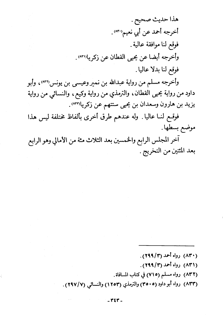 وأخرجه مسلم من رواية عبد اللَّه بن نمير وعيسى بن يونس (¬832)، وأبو داود من رواية يحيى القطان، والترمذي من رواية وكيع، والنسائي من رواية يزيد بن هارون وسعدان بن يحيى ستتهم عن زكريا (¬833).