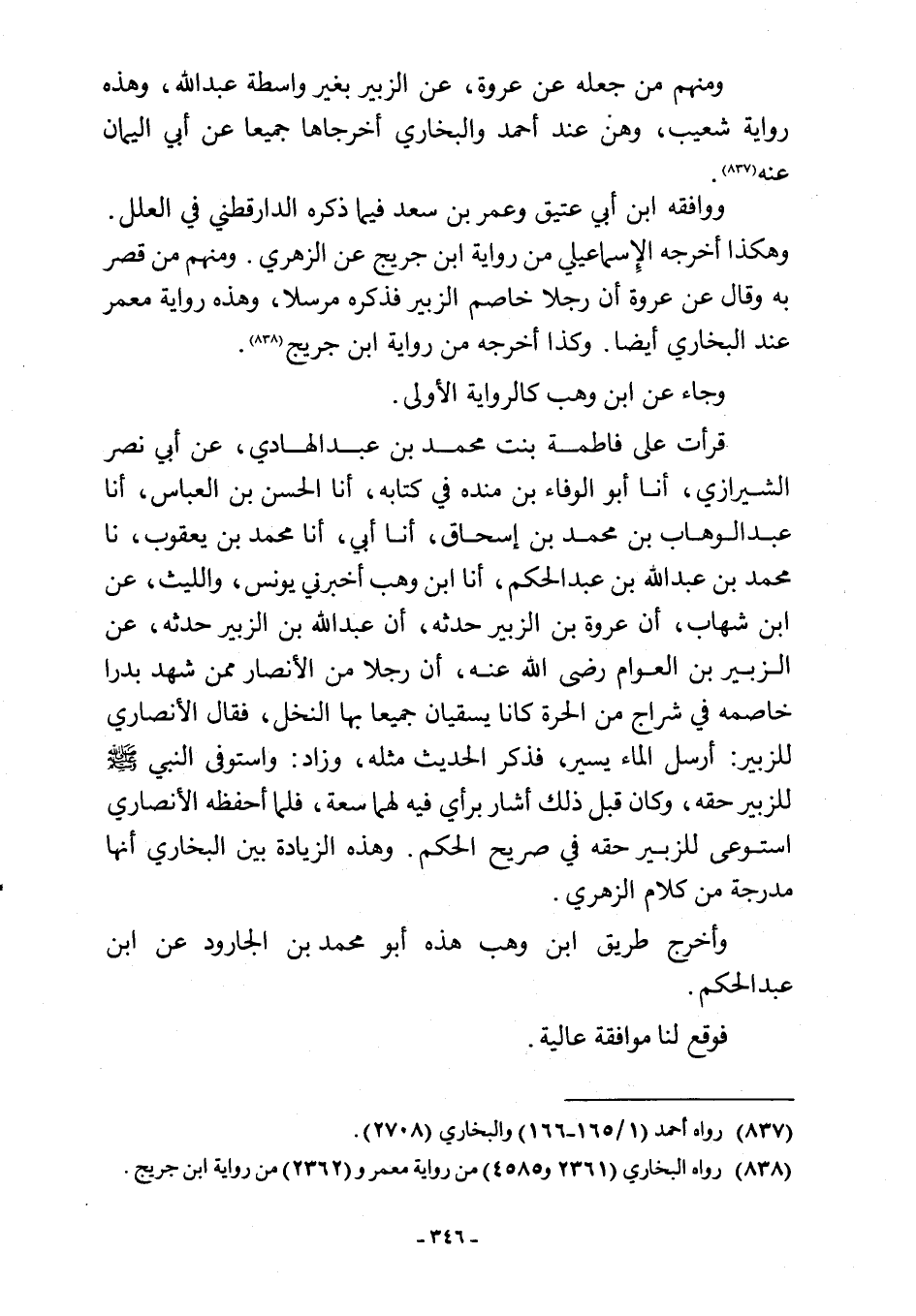 قرأت على فاطمة بنت محمد بن عبد الهادي، عن أبي نصر الشيرازي، أنا أبو الوفاء بن منده في كتابه، أنا الحسن بن العباس، أنا عبد الوهاب بن محمد بن إسحاق، أنا أبي، أنا محمد بن يعقوب، نا محمد بن عبد اللَّه بن عبد الحكم، أنا ابن وهب أخبرني يونس، والليث، عن ابن شهاب، أن عروة بن الزبير حدثه، أن عبد اللَّه بن الزبير حدثه، عن الزبير بن العوام رضي اللَّه عنه، أن رجلا من الأنصار ممن شهد بدرا خاصمه في شراج من الحرة كانا يسقيان جميعا بها النخل، فقال الأنصاري للزبير: أرسل الماء يسير، فذكر الحديث مثله، وزاد: واستوفى النبي -صلى اللَّه عليه وسلم- للزبير حقه، وكان قبل ذلك أشار برأي فيه لهما سعة، فلما أحفظه الأنصاري استوعى للزبير حقه في صريح الحكم. وهذه الزيادة بين البخاري أنها مدرجة من كلام الزهري.