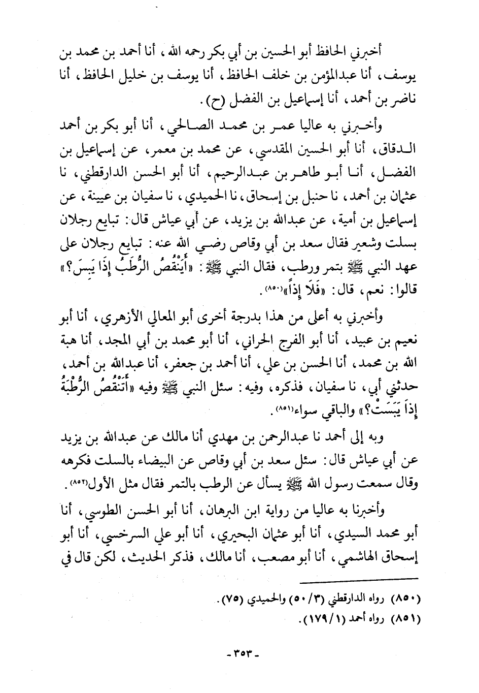 وأخبرني به عاليا عمر بن محمد الصالحي، أنا أبو بكر بن أحمد الدقاق، أنا أبو الحسين المقدسي، عن محمد بن معمر، عن إسماعيل بن الفضل، أنا أبو طاهر بن عبد الرحيم، أنا أبو الحسن الدارقطني، نا عثمان بن أحمد، نا حنبل بن إسحاق، نا الحميدي، نا سفيان بن عيينة، عن إسماعيل بن أمية، عن عبد اللَّه بن يزيد، عن أبي عياش قال: تبايع رجلان بسلت وشعير فقال سعد بن أبي وقاص رضي اللَّه عنه: تبايع رجلان على عهد النبي -صلى اللَّه عليه وسلم- بتمر ورطب، فقال النبي -صلى اللَّه عليه وسلم-: "أَينْقُصُ الرُّطَبُ إِذَا يَبِسَ؟ " قالوا: نعم، قال: "فَلَا إذًا" (¬850).