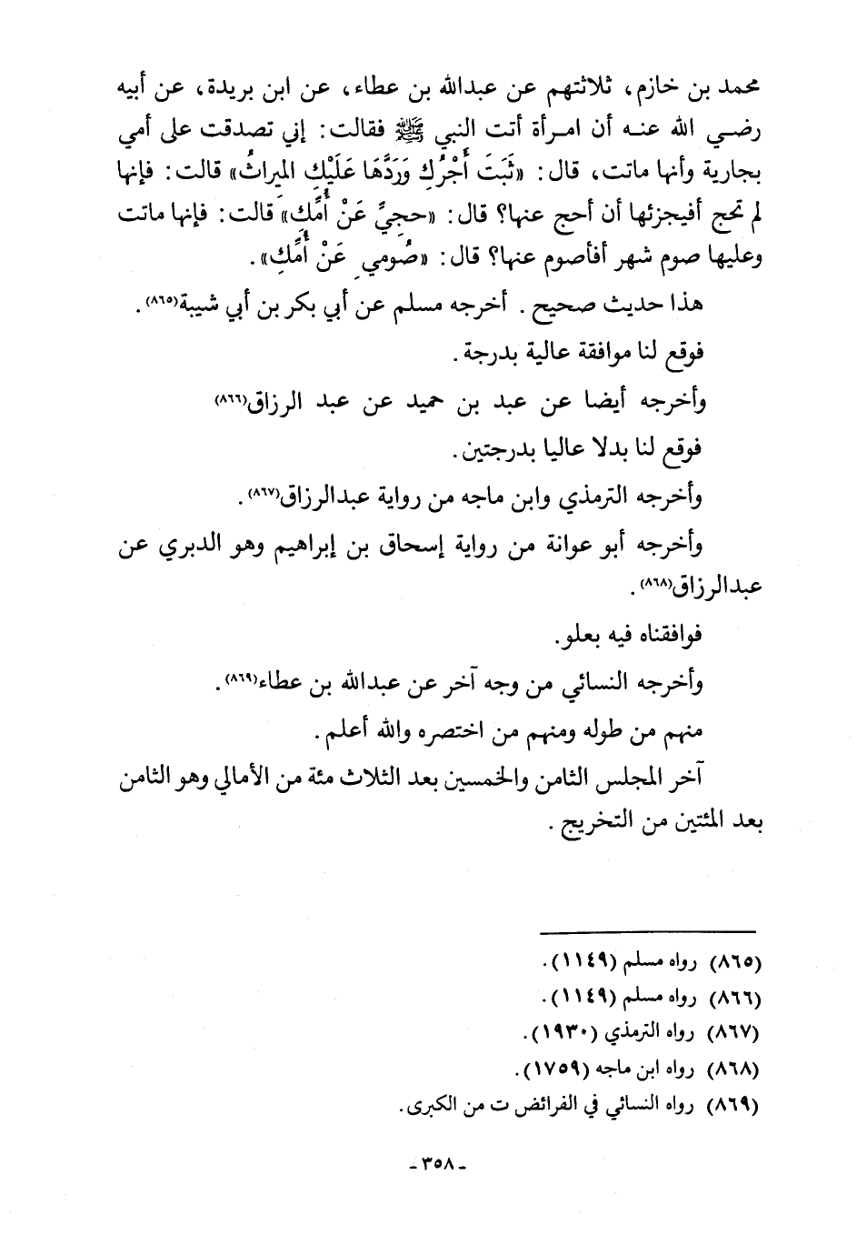 محمد بن خازم، ثلاثتهم عن عبد اللَّه بن عطاء، عن ابن بريدة، عن أبيه رضي اللَّه عنه أن امرأة أتت النبي -صلى اللَّه عليه وسلم- فقالت: إني تصدقت على أمي بجارية وأنها ماتت، قال: "ثَبَتَ أجْرُكِ وَرَدَّهَا عَلَيْكِ المِيراثُ" قالت: فإنها لم تحج أفيجزئها أن أحج عنها؟ قال: "حجِيِّ عَنْ أُمِّكِ" قالت: فإنها ماتت وعليها صوم شهر أفأصوم عنها؟ قال: "صُومِي عَنْ أُمِّكِ".