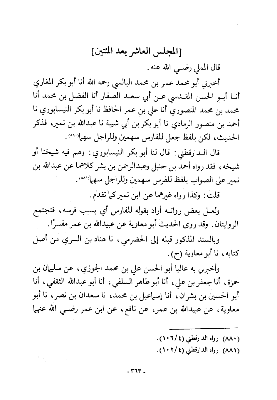 أخبرني أبو محمد عمر بن محمد البالسي رحمه اللَّه أنا أبو بكر المغاري أنا أبو الحسن المقدسي عن أبي سعد الصفار أنا الفضل بن محمد أنا محمد بن محمد المنصوري أنا علي بن عمر الحافظ نا أبو بكر النيسابوري نا أحمد بن منصور الرمادي نا أبو بكر بن أبي شيبة نا عبد اللَّه بن نمير، فذكر الحديث، لكن بلفظ جعل للفارس سهمين وللراجل سهما (¬880).