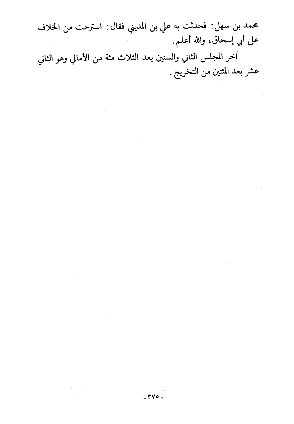 محمد بن سهل: فحدثت به علي بن المديني فقال: استرحت من الخلاف على أبي إسحاق، واللَّه أعلم.