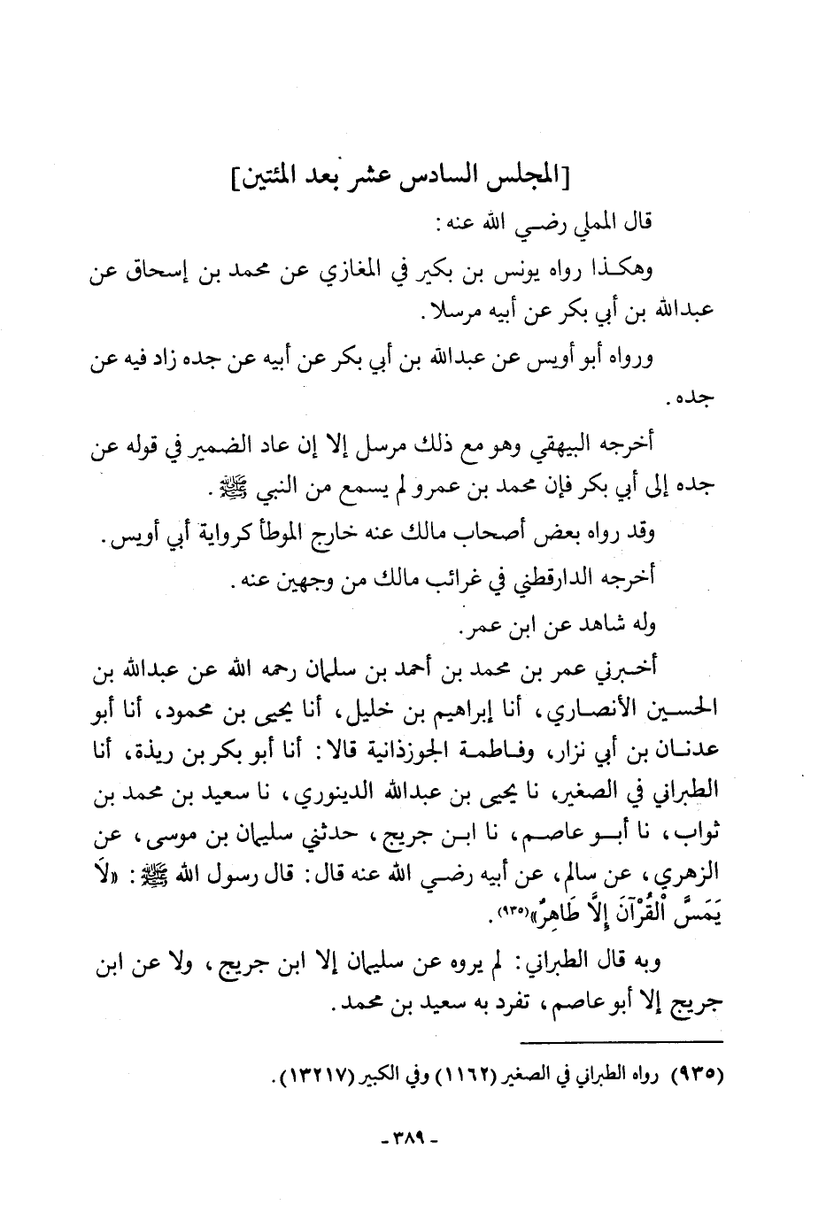 أخبرني عمر بن محمد بن أحمد بن سلمان رحمه اللَّه عن عبد اللَّه بن الحسين الأنصاري، أنا إبراهيم بن خليل، أنا يحيى بن محمود، أنا أبو عدنان بن أبي نزار، وفاطمة الجوزذانية قالا: أنا أبو بكر بن ريذة، أنا الطبراني في الصغير، نا يحيى بن عبد اللَّه الدينوري، نا سعيد بن محمد بن ثواب، نا أبو عاصم، نا ابن جريج، حدثني سليمان بن موسى، عن الزهري، عن سالم، عن أبيه رضي اللَّه عنه قال: قال رسول اللَّه -صلى اللَّه عليه وسلم-: "لَا يَمَسَّ الْقُرْآنَ إِلَّا طَاهِرٌ" (¬935).