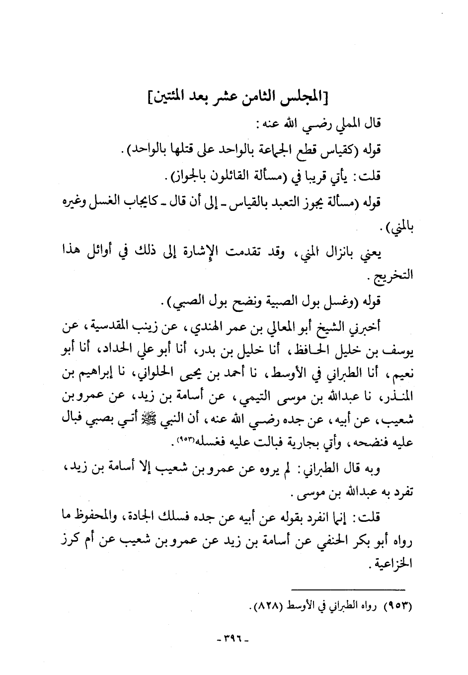 أخبرني الشيخ أبو المعالي بن عمر الهندي، عن زينب المقدسية، عن يوسف بن خليل الحافظ، أنا خليل بن بدر، أنا أبو علي الحداد، أنا أبو نعيم، أنا الطبراني في الأوسط، نا أحمد بن يحيى الحلواني، نا إبراهيم بن المنذر، نا عبد اللَّه بن موسى التيمي، عن أسامة بن زيد، عن عمرو بن شعيب، عن أبيه، عن جده رضي اللَّه عنه، أن النبي -صلى اللَّه عليه وسلم- أتي بصبي فبال عليه فنضحه، وأتي بجارية فبالت عليه فغسله (¬953).