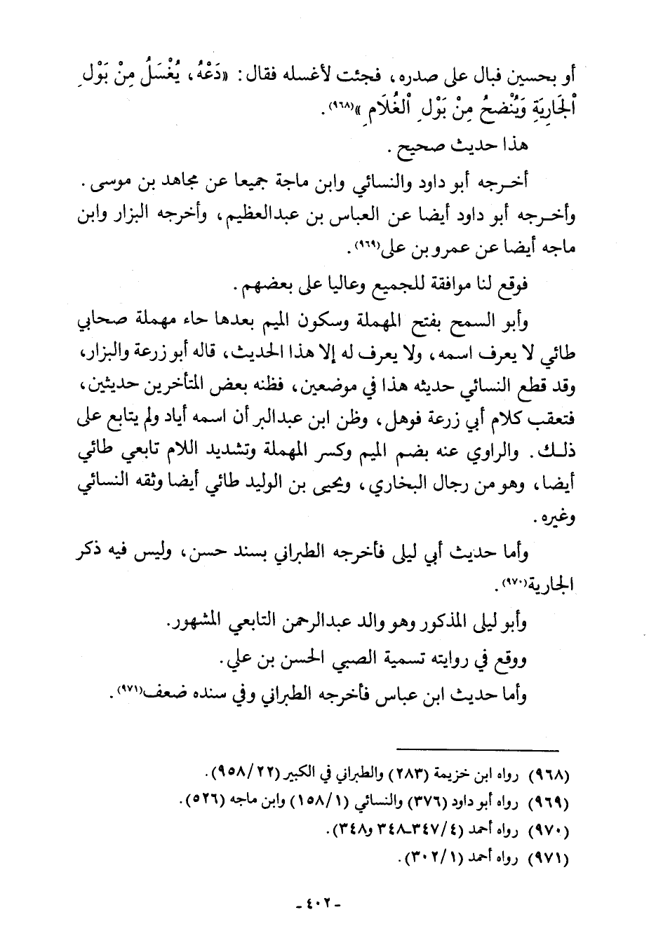 أو بحسين فبال على صدره، فجئت لأغسله فقال: "دَعْهُ، يُغْسَل مِنْ بَوْلِ الْجَارِيَةِ وَيُنْضحُ مِنْ بَوْلِ الْغُلَامِ" (¬968).