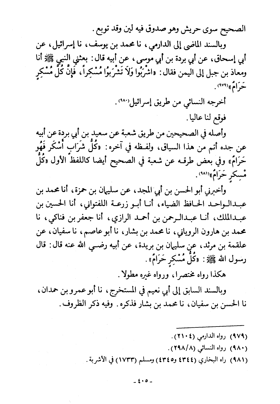وبالسند الماضى إلى الدارمي، نا محمد بن يوسف، نا إسرائيل، عن أبي إسحاق، عن أبي بردة بن أبي موسى، عن أبيه قال: بعثني النبي -صلى اللَّه عليه وسلم- أنا ومعاذ بن جبل إلى اليمن فقال: "اشْرَبُوا وَلَا تَشْرَبوُا مُسْكِرًا، فَإِنَّ كُلَّ مُسْكِرٍ حَرَامٌ" (¬979).
