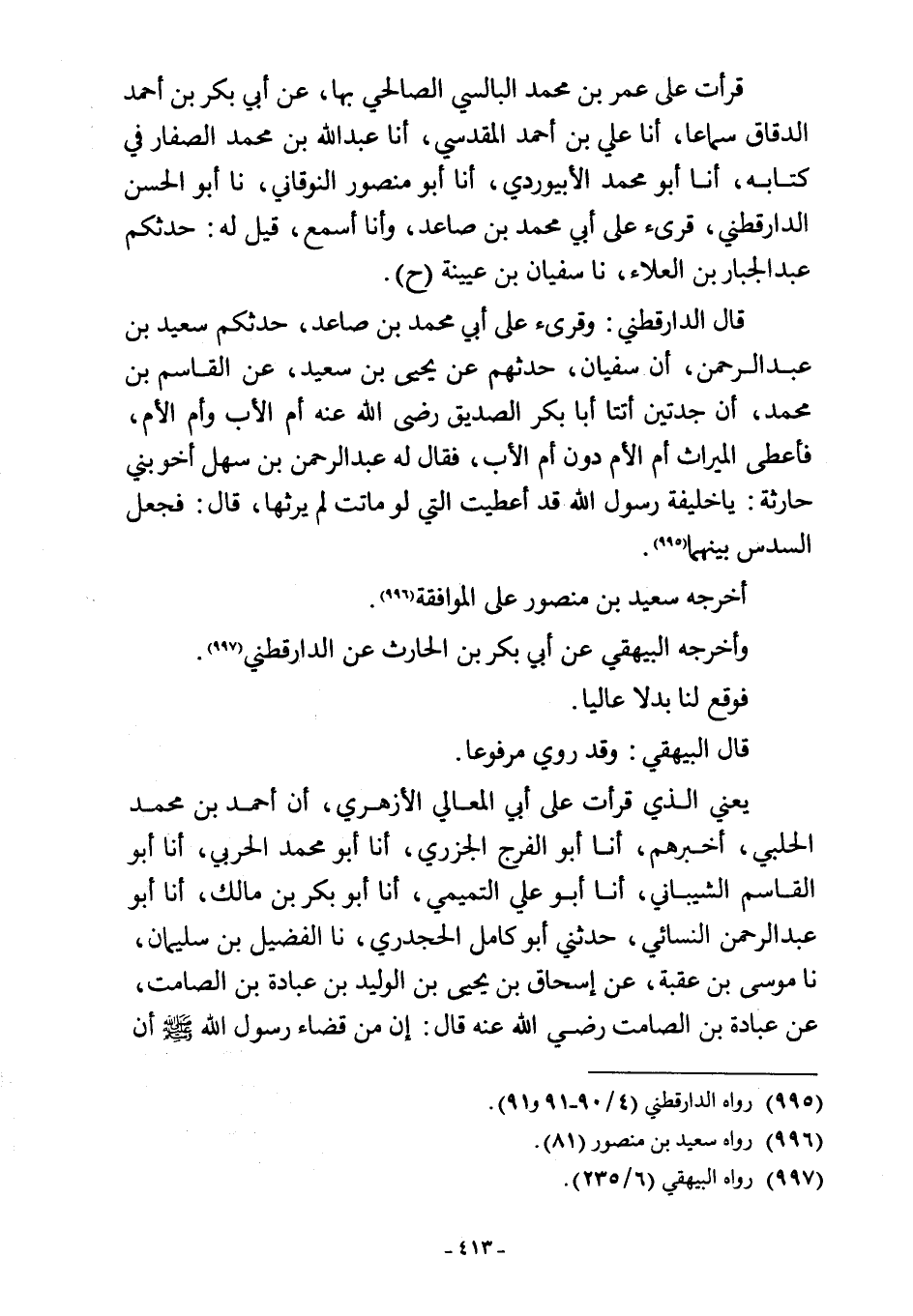 قرأت على عمر بن محمد البالسي الصالحي بها، عن أبي بكر بن أحمد الدقاق سماعا، أنا علي بن أحمد المقدسي، أنا عبد اللَّه بن محمد الصفار في كتابه، أنا أبو محمد الأبيوردي، أنا أبو منصور النوقاني، نا أبو الحسن الدارقطني، قرئ على أبي محمد بن صاعد، وأنا أسمع، قيل له: حدثكم عبد الجبار بن العلاء، نا سفيان بن عيينة (ح).