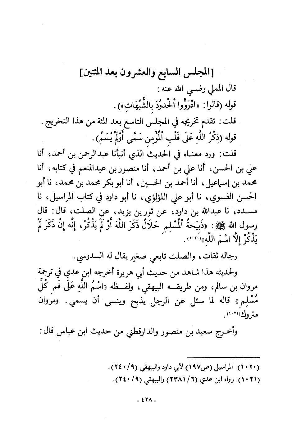 قلت: ورد معناه في الحديث الذي أنبأنا عبد الرحمن بن أحمد، أنا علي بن الحسن، أنا علي بن أحمد، أنا منصور بن عبد المنعم في كتابه، أنا محمد بن إسماعيل، أنا أحمد بن الحسين، أنا أبو بكر محمد بن محمد، نا أبو الحسن الفسوي، نا أبو علي اللؤلؤي، نا أبو داود في كتاب المراسيل، نا مسدد، نا عبد اللَّه بن داود، عن ثور بن يزيد، عن الصلت، قال: قال رسول اللَّه -صلى اللَّه عليه وسلم-: "ذَبِيحَةُ المُسْلِم حَلَالٌ ذَكَر اللَّهَ أَوْ لَمْ يَذْكُرْ، إِنَّه إِنْ ذَكَرَ لَمْ يَذْكُرْ إلَّا اسْمَ اللَّهِ" (¬1020).