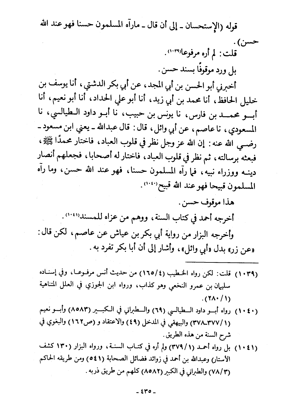 أخبرني أبو الحسن بن أبي المجد، عن أبي بكر الدشتي، أنا يوسف بن خليل الحافظ، أنا محمد بن أبي زيد، أنا أبو علي الحداد، أنا أبو نعيم، أنا أبو محمد بن فارس، نا يونس بن حبيب، نا أبو داود الطيالسي، نا المسعودي، نا عاصم، عن أبي وائل، قال: قال عبد اللَّه -يعني ابن مسعود- رضي اللَّه عنه: إن اللَّه عز وجل نظر في قلوب العباد، فاختار محمدًا -صلى اللَّه عليه وسلم-، فبعثه برسالته، ثم نظر في قلوب العباد، فاختار له أصحابا، فجعلهم أنصار دينه ووزراء نبيه، فما رآه المسلمون حسنا، فهو عند اللَّه حسن، وما رآه المسلمون قبيحا فهو عند اللَّه قبيح (¬1040).