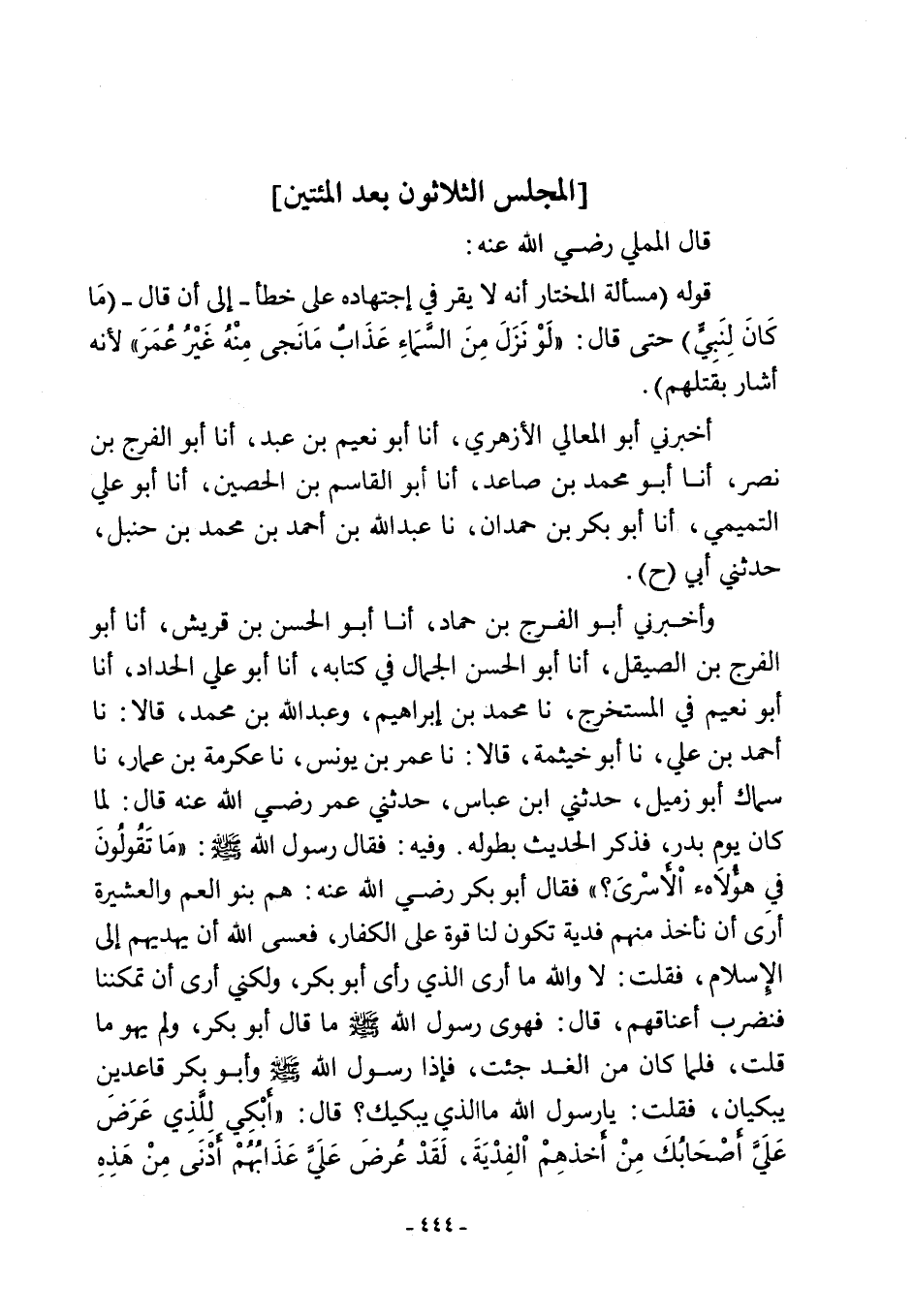 وأخبرني أبو الفرج بن حماد، أنا أبو الحسن بن قريش، أنا أبو الفرج بن الصيقل، أنا أبو الحسن الجمال في كتابه، أنا أبو علي الحداد، أنا أبو نعيم في المستخرج، نا محمد بن إبراهيم، وعبد اللَّه بن محمد، قالا: نا أحمد بن علي، نا أبو خيثمة، قالا: نا عمر بن يونس، نا عكرمة بن عمار، نا سماك أبو زميل، حدثني ابن عباس، حدثني عمر رضي اللَّه عنه قال: لما كان يوم بدر، فذكر الحديث بطوله. وفيه: فقال رسول اللَّه -صلى اللَّه عليه وسلم-: "مَا تَقُولُونَ في هؤُلاء الأَسْرى؟ " فقال أبو بكر رضي اللَّه عنه: هم بنو العم والعشيرة أرى أن نأخذ منهم فدية تكون لنا قوة على الكفار، فعسى اللَّه أن يهديهم إلى الإسلام، فقلت: لا واللَّه ما أرى الذي رأى أبو بكر، ولكني أرى أن تمكننا فنضرب أعناقهم، قال: فهوى رسول اللَّه -صلى اللَّه عليه وسلم- ما قال أبو بكر، ولم يهو ما قلت، فلما كان من الغد جئت، فإذا رسول اللَّه -صلى اللَّه عليه وسلم- وأبو بكر قاعدين يبكيان، فقلت: يا رسول اللَّه ما الذي يبكيك؟ قال: "أَبْكِي لِلَّذِي عَرَضَ عَلِيَّ أَصْحَابُكَ مِنْ أَخذهِمْ الفِدْيَةَ، لَقَدْ عُرضَ عَلَيَّ عَذَابُهُمْ أَدْنَى مِنْ هَذِهِ