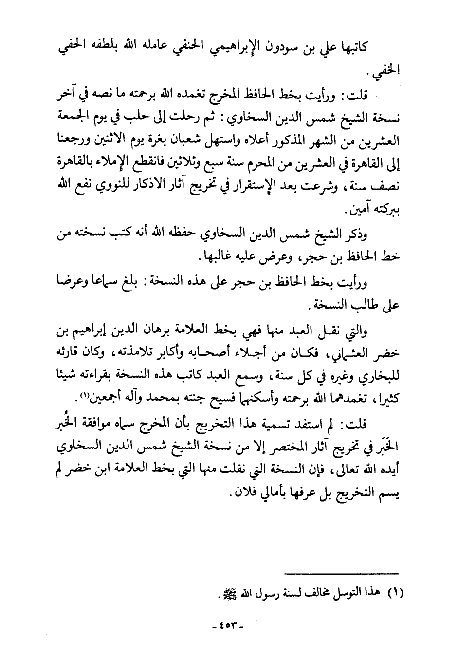 قلت: ورأيت بخط الحافظ المخرج تغمده اللَّه برحمته ما نصه في آخر نسخة الشيخ شمس الدين السخاوي: ثم رحلت إلى حلب في يوم الجمعة العشرين من الشهر المذكور أعلاه واستهل شعبان بغرة يوم الاثنين ورجعنا إلى القاهرة في العشرين من المحرم سنة سبع وثلاثين فانقطع الإملاء بالقاهرة نصف سنة، وشرعت بعد الإستقرار في تخريج آثار الاذكار للنووي نفع اللَّه ببركته آمين.