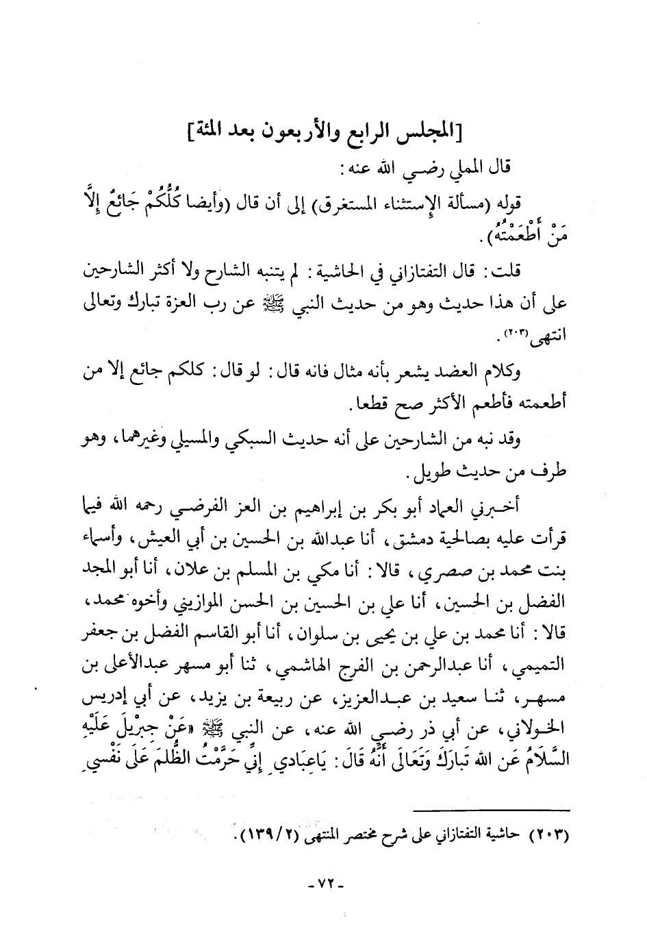 قلت: قال التفتازاني في الحاشية: لم يتنبه الشارح ولا أكثر الشارحين عام أن هذا حديث وهو من حديث النبي -صلى اللَّه عليه وسلم- عن رب العزة تبارك وتعالى انتهى (¬203).