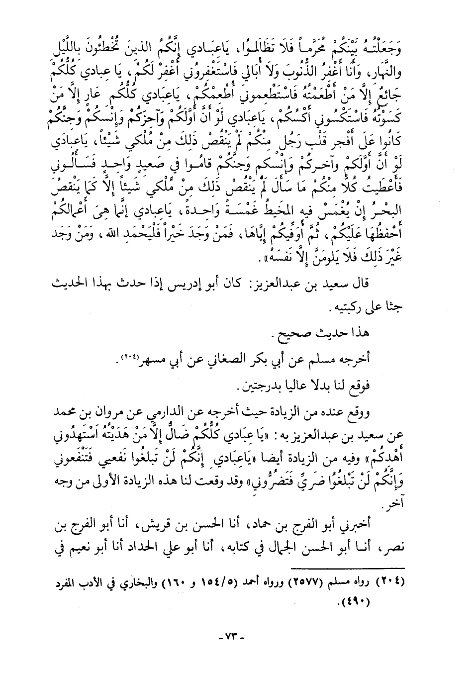 وَجَعَلْتُهُ بَيْنَكُمْ مُحَرَّمًا فَلَا تَظَالوُا، يَا عِبَادي إِنَّكُمُ الذينَ تُخْطئُونَ باللَّيْلِ والنَّهَارِ، وَأَنَا أَغْفِرُ الذُّنُوبَ وَلَا أُبَالِي فَاسْتَغْفِروُني أَغْفِرْ لَكُمْ، يَا عِبَاديَ كُلُّكُمْ جَائِعٌ إِلَّا مَنْ أَطْعَمْتُهُ فَاسْتَطْعِمونِي أُطْعِمْكُمْ، يَا عِبَادي كُلُّكُم عَارٍ إِلَّا مَنْ كَسَوْتُهُ فَاسْتَكْسُوني أَكْسُكُمْ، يَا عِبَادي لَوْ أَنَّ أَوَلَكُمْ وَآخِرَكُمْ وَإِنْسَكُمْ وَجِنَّكُمْ كَانُوا عَلى أَفْجر قَلْبِ رَجُلٍ مِنْكُم لَمْ يَنْقُصْ ذَلِكَ مِنْ مُلْكي شَيْئًا، يَا عِبادَي لَوْ أَنَّ أَوَّلَكم وآخركُمْ وَإِنْسَكم وجِنَكُمْ قامُوا فِي صَعيدٍ وَاحِدٍ فَسَأَلُوني فَأَعْطَيتُ كُلًّا مِنْكُمْ مَا سَأَلَ لَمْ يَنْقُصْ ذَلِكَ مِنْ مُلْكي شَيئًا إِلَّا كَمَا يَنْقصُ البحْرُ إِنْ يُغْمَسْ فيه المخَيطُ غَمْسَةَ وَاحِدةً، يَا عِبَادي إِنَّما هِيَ أَعْمالُكمْ أَحْفظُهَا عَلَيْكُمْ، ثُمَّ أُوَفُيكُمْ إِيَّاهَا، فَمَنْ وَجَدَ خَيْرًا فَلْيَحْمَدِ اللَّه، وَمَنْ وَجَد غَيْرَ ذَلِكَ فَلَا يَلومَنَّ إِلَّا نَفسَهُ".