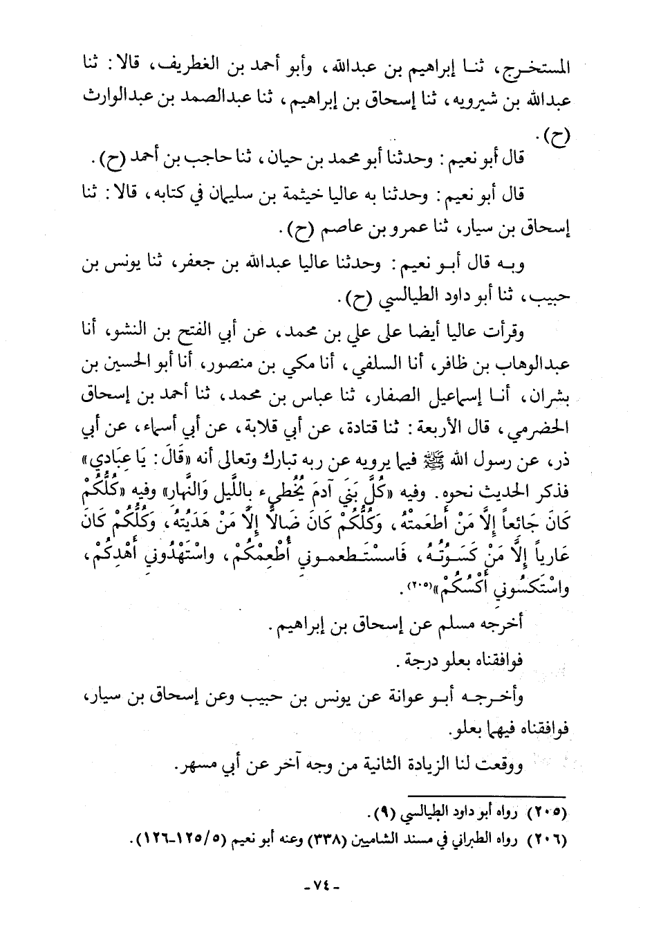 وقرأت عاليا أيضًا على علي بن محمد، عن أبي الفتح بن النشو، أنا عبد الوهاب بن ظافر، أنا السلفي، أنا مكي بن منصور، أنا أبو الحسين بن بشران، أنا إسماعيل الصفار، ثنا عباس بن محمد، ثنا أحمد بن إسحاق الحضرمي، قال الأربعة: ثنا قتادة، عن أبي قلابة، عن أبي أسماء، عن أبي ذر، عن رسول اللَّه -صلى اللَّه عليه وسلم- فيما يرويه عن ربه تبارك وتعالى أنه "قَالَ: يَا عِبَادي" فذكر الحديث نحوه. وفيه "كُلَّ بَنَي آدمَ يُخُطئ باللَّيل وَالنَّهارِ" وفيه "كُلُّكُم كَانَ جَائِعًا إِلَّا مَنْ اطعَمتْهُ، وَكُلُّكُمْ كَانَ ضَالًّا إِلَّا مَنْ هَدَيُتهُ، وَكُلُّكُمْ كَانَ عَاريًا إِلَّا مَنْ كَسَوُتُهُ، فَاسْتَطعمونِي أُطْعِمْكُمْ، واسْتَهْدُوني أَهْدِكُمْ، واسْتَكسُوني أَكْسُكُمْ" (¬205).