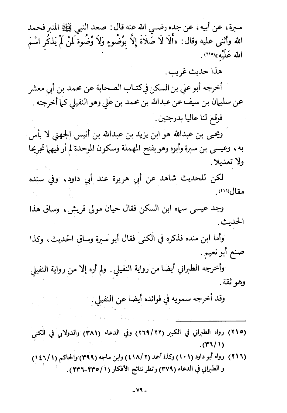 سبرة، عن أبيه، عن جده رضي اللَّه عنه يأتي: صعد النبي -صلى اللَّه عليه وسلم- المنبر فحمد اللَّه وأثنى عليه وقال: "أَلَا لَا صَلَاةَ إِلَّا بِوُضُوء وَلَا وُضُوءَ لمَنْ لَمْ يَذكُر اسْمَ اللَّه عَلَيْهِ" (¬215).
