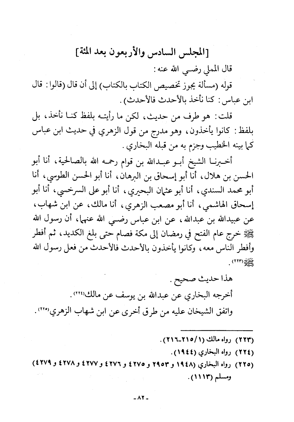 أخبرنا الشيخ أبو عبد اللَّه بن قوام رحمه اللَّه بالصالحية، أنا أبو الحسن بن هلال، أنا أبو إسحاق بن البرهان، أنا أبو الحسن الطوسي، أنا أبو محمد السندي، أنا أبو عثمان البحيري، أنا أبو عام السرخسي، أنا أبو إسحاق الهاشمي، أنا أبو مصعب الزهري، أنا مالك، عن ابن شهاب، عن عبيد اللَّه بن عبد اللَّه، عن ابن عباس رضي اللَّه عنهما، أن رسول اللَّه -صلى اللَّه عليه وسلم- خرج عام الفتح في رمضان إلى مكة فصام حتى بلغ الكديد، ثم أفطر وأفطر الناس معه، وكانوا يأخذون بالأحدث فالأحدث من فعل رسول اللَّه -صلى اللَّه عليه وسلم- (¬223).