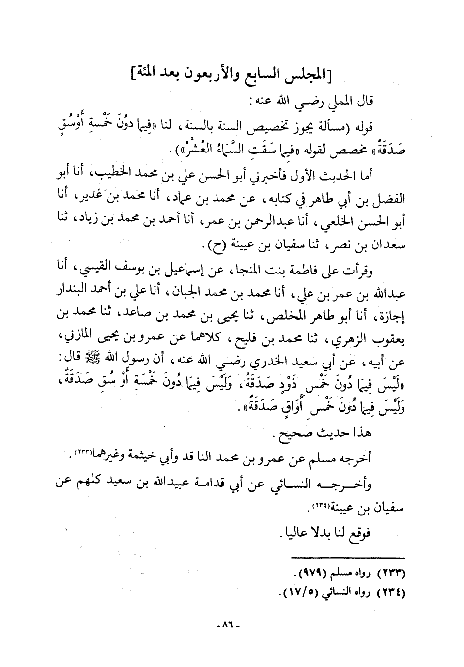 وقرأت على فاطمة بنت المنجا، عن إسماعيل بن يوسف القيسي، أنا عبد اللَّه بن عمر بن علي، أنا محمد بن محمد الجبان، أنا علي ابن أحمد البندار إجازة، أنا أبو طاهر المخلص، ثنا يحيى بن محمد بن صاعد، ثنا محمد بن يعقوب الزهري، ثنا محمد بن فليح، كلاهما عن عمرو بن يحيى المازني، عن أبيه، عن أبي سعيد الخدري رضي اللَّه عنه، أن رسول اللَّه -صلى اللَّه عليه وسلم- قال: "لَيْسَ فِيمَا دُونَ خَمْس ذَوْدٍ صَدَقَةٌ، وَلَيْسَ فِيمَا دُونَ خَمْسَةِ أوْسُقِ صَدَقَةٌ، وَليْسَ فِيما دُونَ خَمْسِ أَوَاقٍ صَدَقَةٌ".
