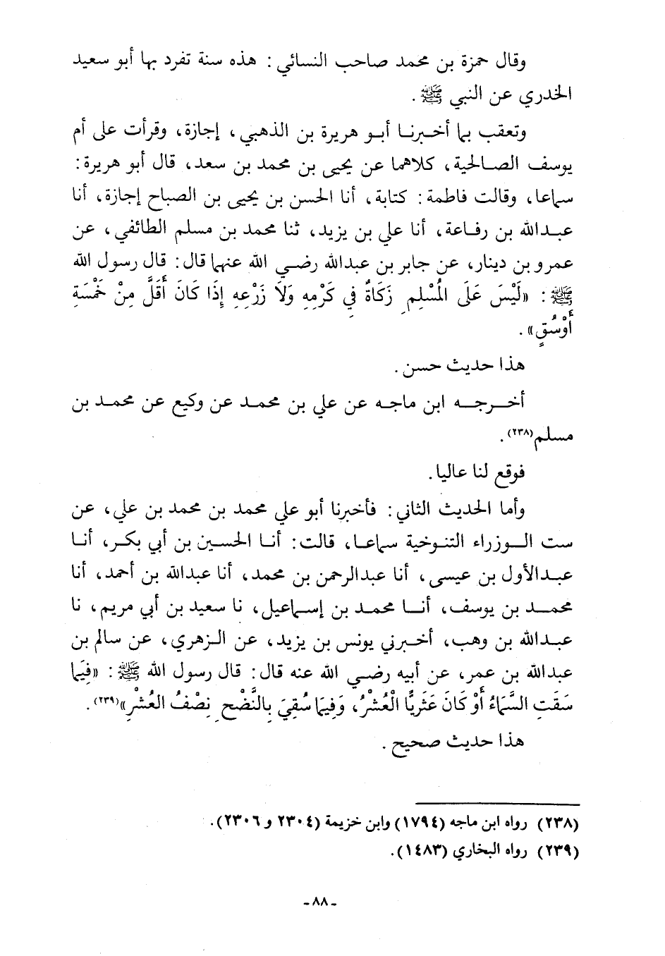 وأما الحديث الثاني: فأخبرنا أبو علي محمد بن محمد بن علي، عن ست الوزراء التنوخية سماعا، قالت: أنا الحسين بن أبي بكر، أنا عبد الأول بن عيسى، أنا عبد الرحمن بن محمد، أنا عبد اللَّه بن أحمد، أنا محمد بن يوسف، أنا محمد بن إسماعيل، نا سعيد بن أبي مريم، نا عبد اللَّه بن وهب، أخبرني يونس بن يزيد، عن الزهري، عن سالم بن عبد اللَّه بن عمر، عن أبيه رضي اللَّه عنه قال: قال رسول اللَّه -صلى اللَّه عليه وسلم-: "فِيَما سَقَتِ السَّمَاء أَوْ كَانَ عَثَريًّا الْعُشْرُ، وَفِيمَا سُقِيَ بِالنَّضْحِ نِصْفُ العُشْرِ" (¬239).
