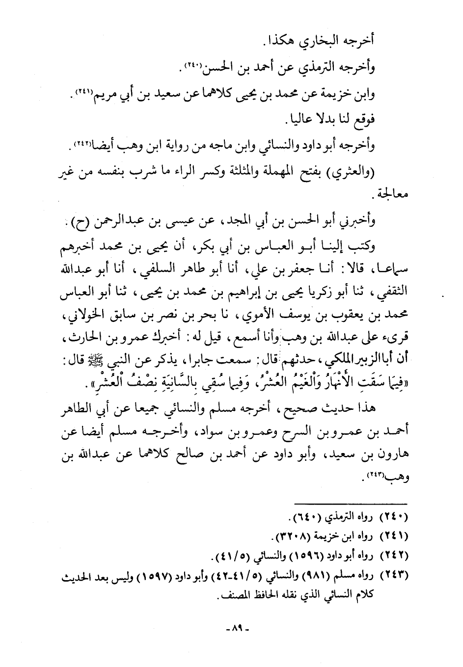 وكتب إلينا أبو العباس بن أبي بكر، أن يحيى بن محمد أخبرهم سماعا، قالا: أنا جعفر بن علي، أنا أبو طاهر السلفي، أنا أبو عبد اللَّه الثقفي، ثنا أبو زكريا يحيى بن إبراهيم بن محمد بن يحيى، ثنا أبو العباس محمد بن يعقوب بن يوسف الأموي، نا بحر بن نصر بن سابق الخولاني، قرئ على عبد اللَّه بن وهب وأنا أسمع، قيل له: أخبرك عمرو بن الحارث، أن أبا الزبير الملكي، حدثهم: قال: سمعت جابرا، يذكر عن النبي -صلى اللَّه عليه وسلم- قال: "فِيمَا سَقَتِ الأَنْهَارُ وَالغَيْمُ العُشْرُ، وَفِيمَا سُقِي بِالسَّانِيَةِ نِصْفُ الْعُشْرِ".