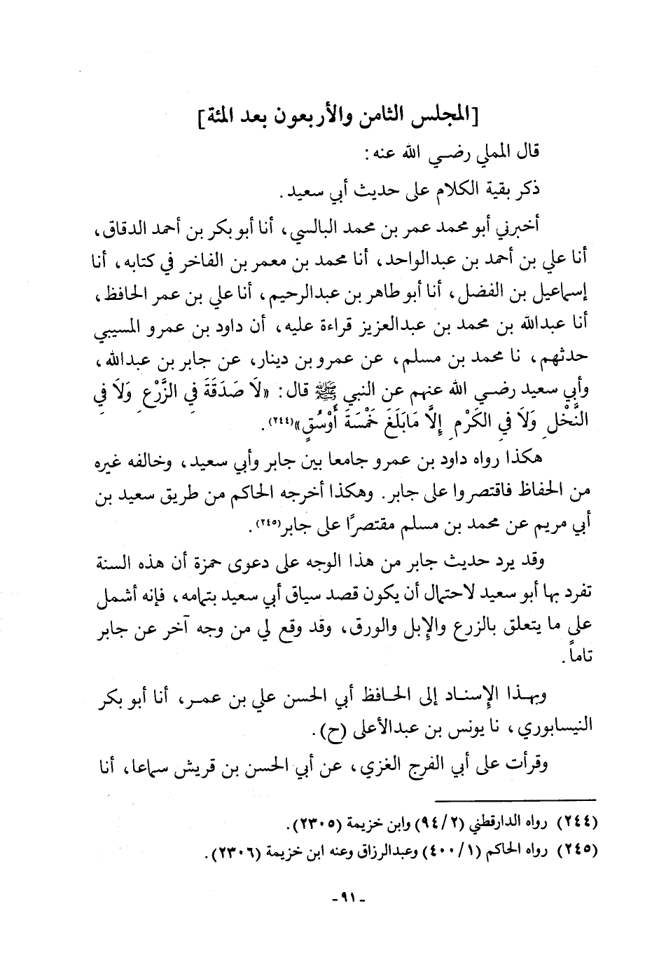 أخبرني أبو محمد عمر بن محمد البالسي، أنا أبو بكر بن أحمد الدقاق، أنا علي بن أحمد بن عبد الواحد، أنا محمد بن معمر بن الفاخر في كتابه، أنا إسماعيل بن الفضل، أنا أبو طاهر بن عبد الرحيم، أنا علي بن عمر الحافظ، أنا عبد اللَّه بن محمد بن عبد العزيز قراءة عليه، أن داود بن عمرو المسيبي حدثهم، نا محمد بن مسلم، عن عمرو بن دينار، عن جابر بن عبد اللَّه، وأبي سعيد رضي اللَّه عنهم عن النبي -صلى اللَّه عليه وسلم- قال: "لَا صَدَقَةَ فِي الزَّرْعِ وَلَا فِي النَّخْلِ وَلَا فِي الكَرْمِ إِلَّا مَا بَلَغَ خَمْسَةَ أَوْسُقٍ" (¬244).