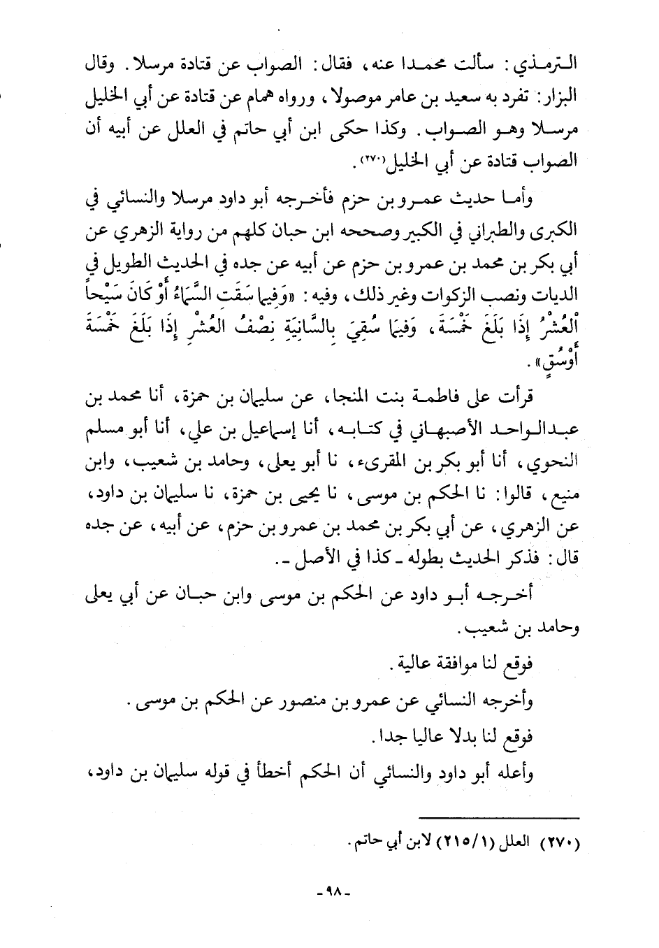 قرأت عام فاطمة بنت المنجا، عن سليمان بن حمزة، أنا محمد بن عبد الواحد الأصبهاني في كتابه، أنا إسماعيل بن علي، أنا أبو مسلم النحوي، أنا أبو بكر بن المقرئ، نا أبو يعلى، وحامد بن شعيب، وابن منيع، قالوا: نا الحكم بن موسى، نا يحيى بن حمزة، نا سليمان بن داود، عن الزهري، عن أبي بكر بن محمد بن عمرو بن حزم، عن أبيه، عن جده قال: فذكر الحديث بطوله -كذا في الأصل-.