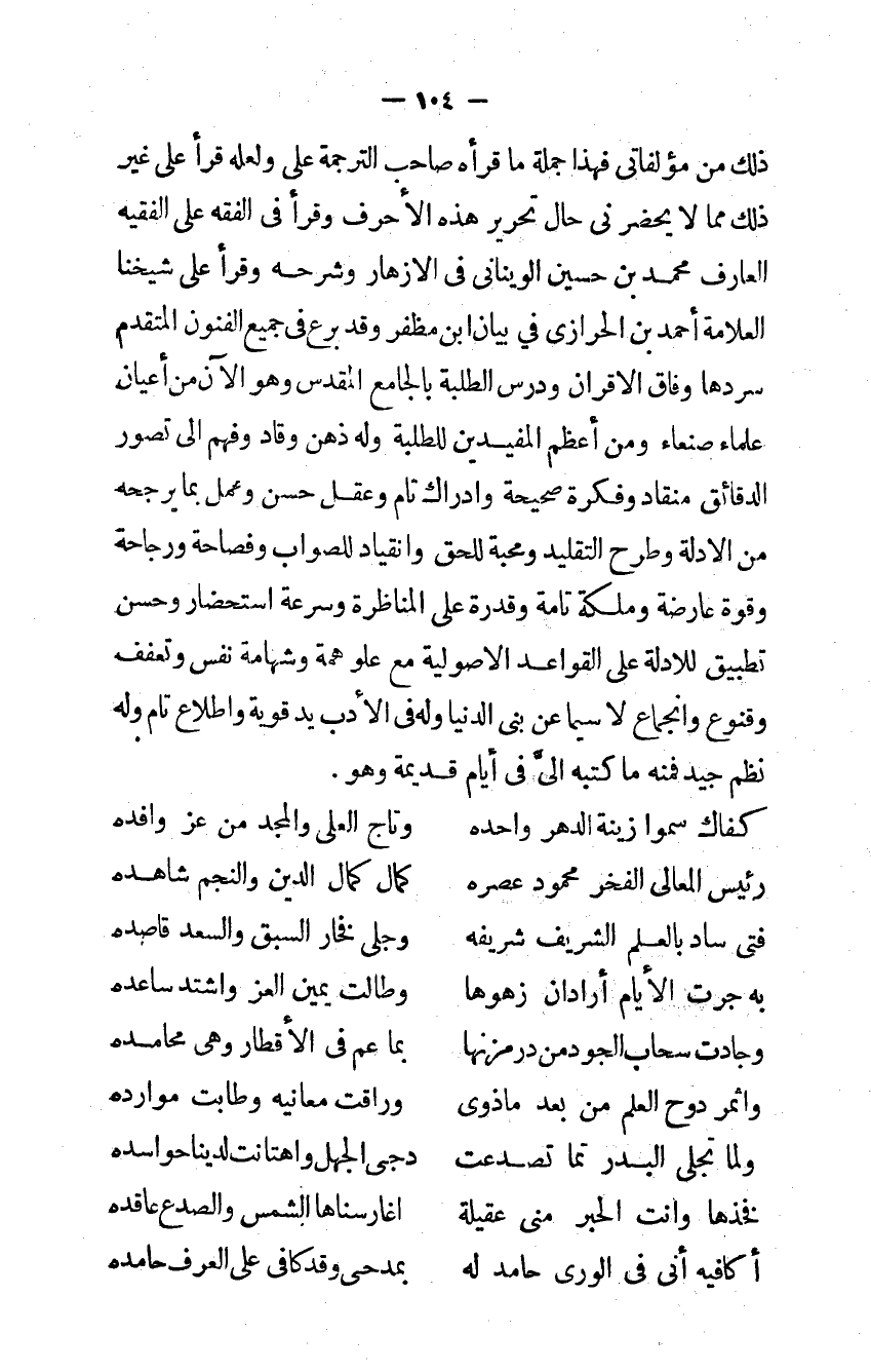 ذَلِك من مؤلفاتي فَهَذَا جملَة مَا قَرَأَهُ صَاحب التَّرْجَمَة على وَلَعَلَّه قَرَأَ على غير ذَلِك مِمَّا لَا يحضرني حَال تَحْرِير هَذِه الأحرف وَقَرَأَ فِي الْفِقْه على الْفَقِيه الْعَارِف مُحَمَّد بن حُسَيْن الويناني فِي الأزهار وَشَرحه وَقَرَأَ على شَيخنَا الْعَلامَة أَحْمد بن الحرازي فِي بَيَان ابْن مظفر وَقد برع فِي جَمِيع الْفُنُون الْمُتَقَدّم سردها وفَاق الأقران ودرس الطّلبَة بالجامع الْمُقَدّس وَهُوَ الْآن من أَعْيَان عُلَمَاء صنعاء وَمن أعظم المفيدين للطلبة وَله ذهن وقاد وَفهم إِلَى تصور الدقائق منقاد وفكرة صَحِيحَة وَإِدْرَاك تَامّ وعقل حسن وَعمل بِمَا يرجحه من الْأَدِلَّة وَطرح التَّقْلِيد ومحبة للحق وانقياد للصَّوَاب وفصاحة ورجاحة وَقُوَّة عارضة وملكة تَامَّة وقدرة على المناظرة وَسُرْعَة استحضار وَحسن تطبيق للأدلة على الْقَوَاعِد الْأُصُولِيَّة مَعَ علو همة وشهامة نفس وتعفف وقنوع وانجماع لَا سِيمَا عَن بني الدُّنْيَا وَله فِي الْأَدَب يَد قَوِيَّة واطلاع تَامّ وَله نظم جيد فَمِنْهُ مَا كتبه إِلَى فِي أَيَّام قديمَة وَهُوَ