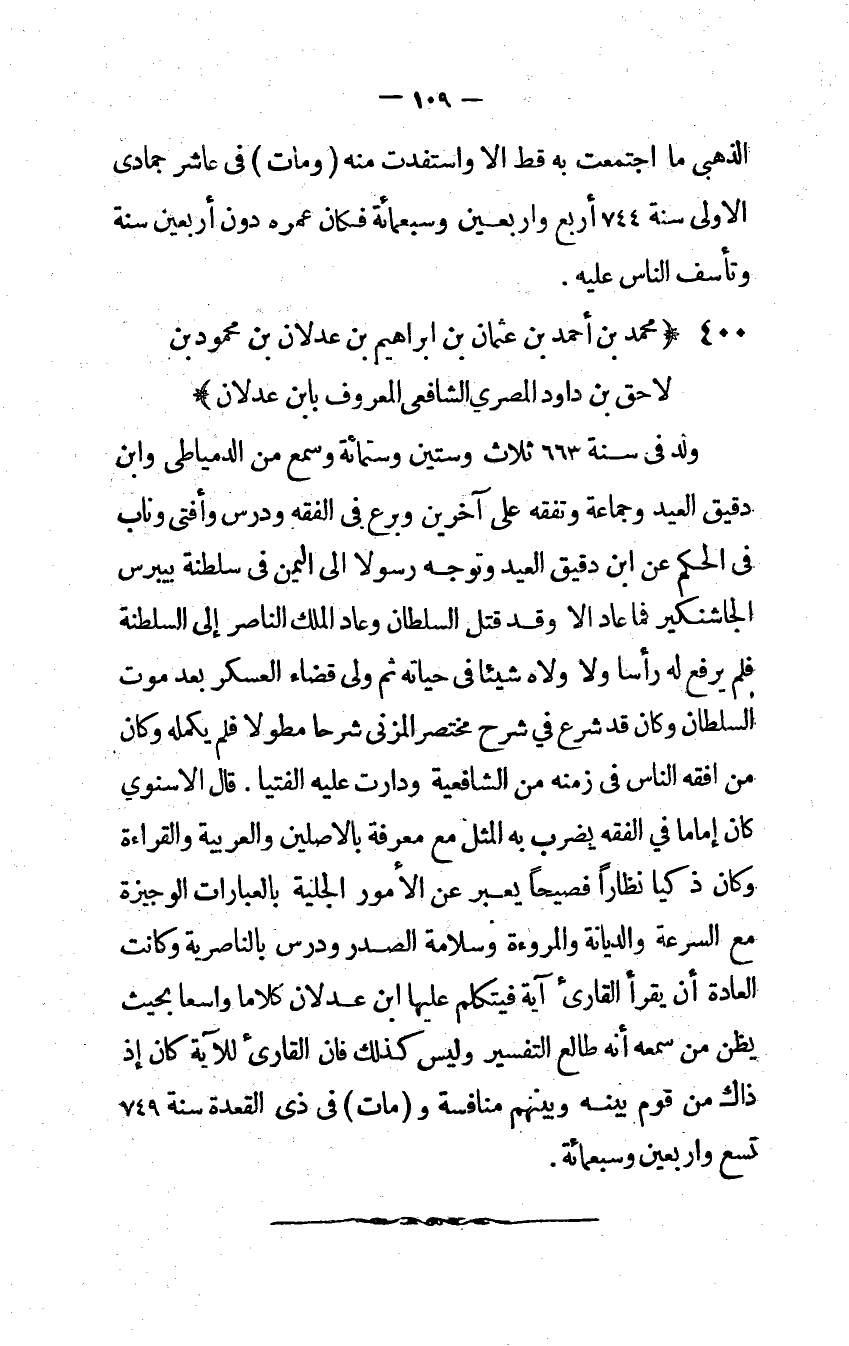 قَالَ الأسنوي كَانَ إِمَامًا فِي الْفِقْه يضْرب بِهِ الْمثل مَعَ معرفَة بالأصلين والعربية وَالْقِرَاءَة وَكَانَ ذكيا نظارا فصيحا يعبر عَن الْأُمُور الجلية بالعبارات الوجيزة مَعَ السرعة والديانة والمروءة وسلامة الصَّدْر ودرس بالناصرية وَكَانَت الْعَادة أَن يقْرَأ الْقَارئ آيَة فيتكلم عَلَيْهَا ابْن عَدْلَانِ كلَاما وَاسِعًا بِحَيْثُ يظن من سَمعه أَنه طالع التَّفْسِير وَلَيْسَ كَذَلِك فَإِن الْقَارئ لِلْآيَةِ كَانَ إِذْ ذَاك من قوم بَينه وَبينهمْ مُنَافَسَة وَمَات فِي ذي الْقعدَة سنة 749 تسع وَأَرْبَعين وَسَبْعمائة