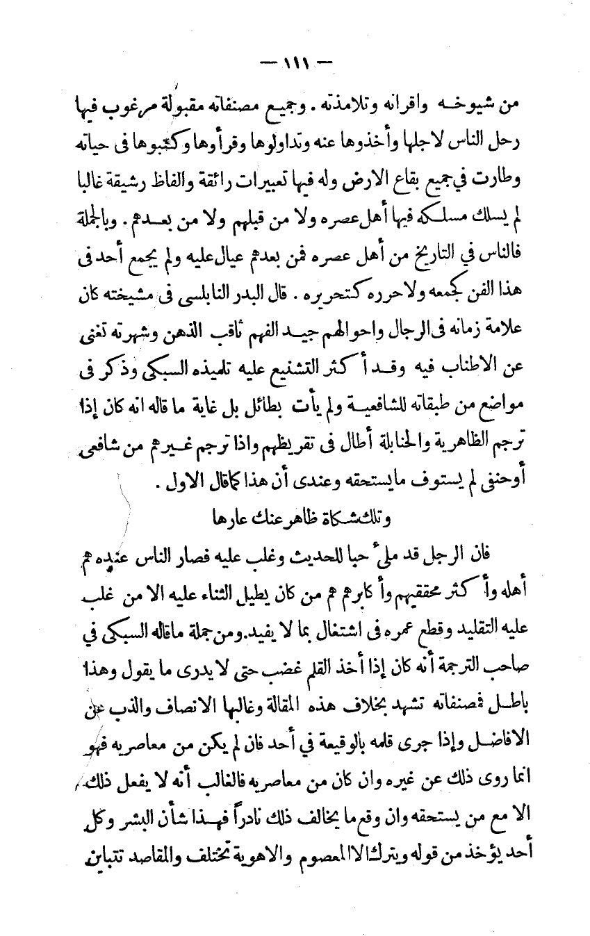 وَمن جملَة مَا قَالَه السبكي فِي صَاحب التَّرْجَمَة أَنه كَانَ إِذا أَخذ الْقَلَم غضب حَتَّى لَا يدرى مايقول وَهَذَا بَاطِل فمصنفاته تشهد بِخِلَاف هَذِه الْمقَالة وغالبها الْإِنْصَاف والذب عَن الأفاضل وَإِذا جرى قلمه بالوقيعة فِي أحد لم يكن من معاصريه فَهُوَ إنما روى ذَلِك عَن غَيره وَإِن كَانَ من معاصريه فالغالب أَنه لَا يفعل ذَلِك إلا مَعَ من يسْتَحقّهُ وَإِن وَقع مَا يُخَالف ذَلِك نَادرا فَهَذَا شَأْن الْبشر وكل أحد يُؤْخَذ من قَوْله وَيتْرك إلا الْمَعْصُوم والأهوية تخْتَلف والمقاصد تتباين