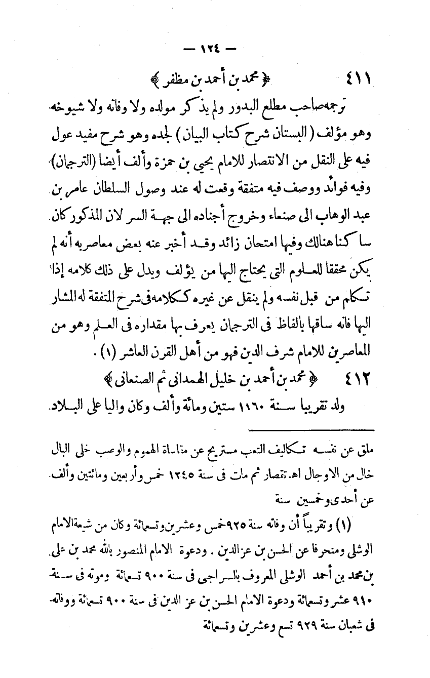 تَرْجمهُ صَاحب مطلع البدور وَلم يذكر مولده وَلَا وَفَاته وَلَا شُيُوخه وَهُوَ مؤلف الْبُسْتَان شرح كتاب الْبَيَان لجده وَهُوَ شرح مُفِيد عول فِيهِ على النَّقْل من الِانْتِصَار للْإِمَام يحيى بن حَمْزَة وَألف أَيْضا الترجمان وَفِيه فَوَائِد وصف فِيهِ متفقة وَقعت لَهُ عِنْد وُصُول السُّلْطَان عَامر بن عبد الْوَهَّاب إِلَى صنعاء وَخُرُوج أجناده إِلَى جِهَة السِّرّ لِأَن الْمَذْكُور كَانَ سَاكِنا هُنَالك وفيهَا امتحان زَائِد وَقد أخبر عَنهُ بعض معاصريه أَنه لم يكن محققا للعلوم الَّتِى يحْتَاج إِلَيْهَا من يؤلف وَيدل على ذَلِك كَلَامه إِذا تكلم من قبل نَفسه وَلم ينْقل عَن غَيره ككلامه فِي شرح المتفقة لَهُ الْمشَار إِلَيْهَا فَإِنَّهُ سَاقهَا بِأَلْفَاظ فِي الترجمان يعرف بهَا مِقْدَاره فِي الْعلم وَهُوَ من المعاصرين للْإِمَام شرف الدَّين فَهُوَ من أهل الْقرن الْعَاشِر