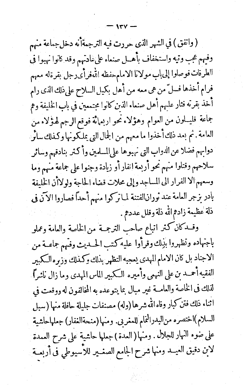 ثمَّ بعد ذَلِك أخذُوا مَا مَعَهم من الْجمال الَّتِى يملكونها وَكَذَلِكَ سَائِر دوابهم فضلا عَن الدَّوَابّ الَّتِى نهبوها على الْمُسلمين وَأكْثر بنادقهم وَسَائِر سِلَاحهمْ وَقتلُوا مِنْهُم نَحْو أَرْبَعَة أنفار أَو زِيَادَة وجنوا على جمَاعَة مِنْهُم وَمَا وسعهم إلا الْفِرَار إِلَى الْمَسَاجِد وَإِلَى محلات قَضَاء الْحَاجة وَلَوْلَا أَن الْخَلِيفَة بَادر بزجر الْعَامَّة عِنْد ثوران الْفِتْنَة لما تركُوا مِنْهُم أحد فصاروا الْآن فِي ذلة عَظِيمَة زادهم الله ذلة وقلل عَددهمْ