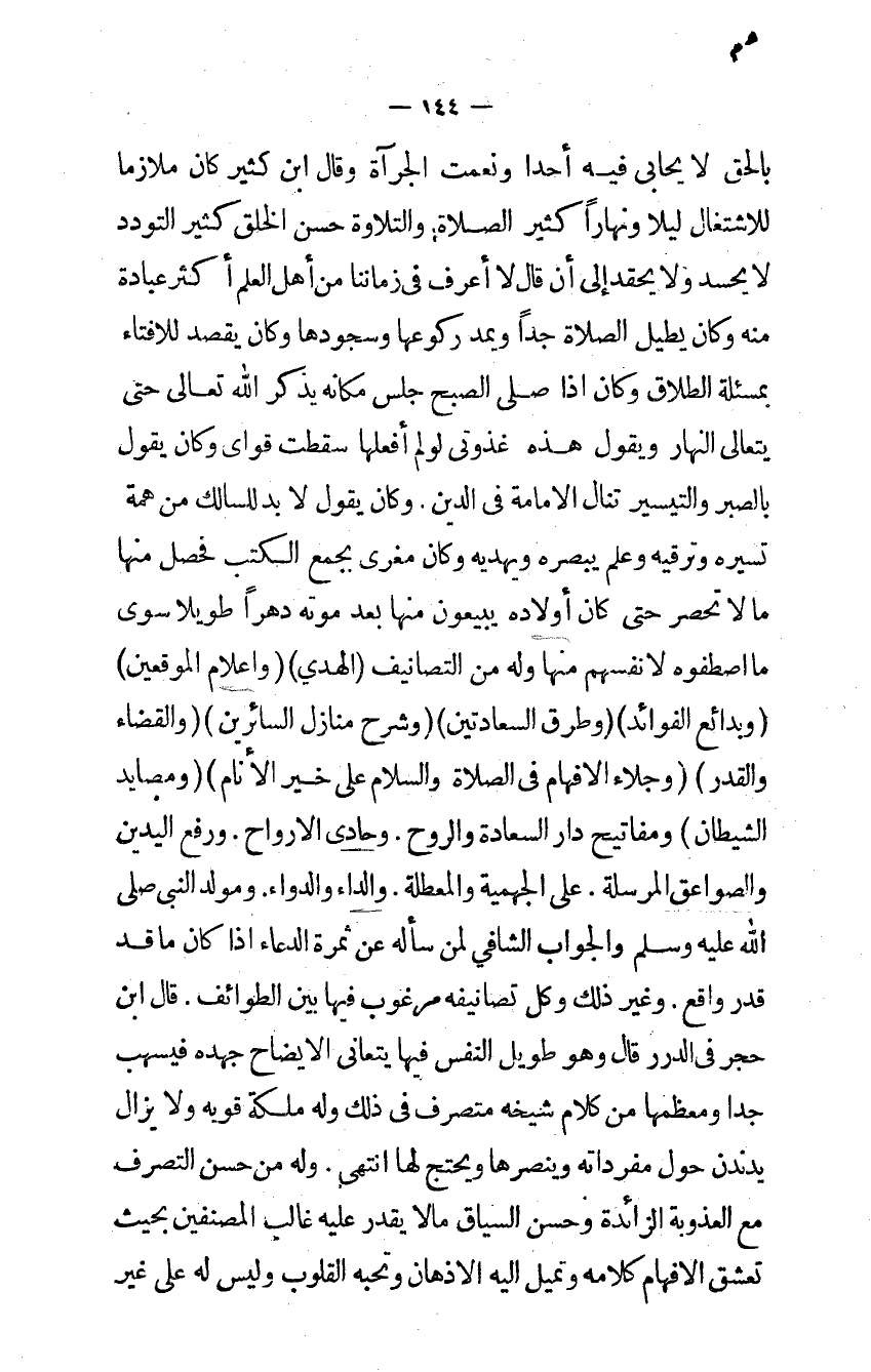 وَكَانَ يَقُول لَا بُد للسالك من همة تسيره وترقيه وَعلم يبصره ويهديه وَكَانَ مغرى بِجمع الْكتب فَحصل مِنْهَا مَا لَا تحصر حَتَّى كَانَ أَوْلَاده يبيعون مِنْهَا بعد مَوته دهرا طَويلا سوى مَا اصطفوه لأَنْفُسِهِمْ مِنْهَا وَله من التصانيف الْهَدْي وأعلام الموقعين وبدائع الْفَوَائِد وطرق السعادتين وَشرح منَازِل السائرين وَالْقَضَاء وَالْقدر وجلاء الأفهام فِي الصَّلَاة وَالسَّلَام على خير الْأَنَام ومصايد الشَّيْطَان ومفاتيح دَار السَّعَادَة وَالروح