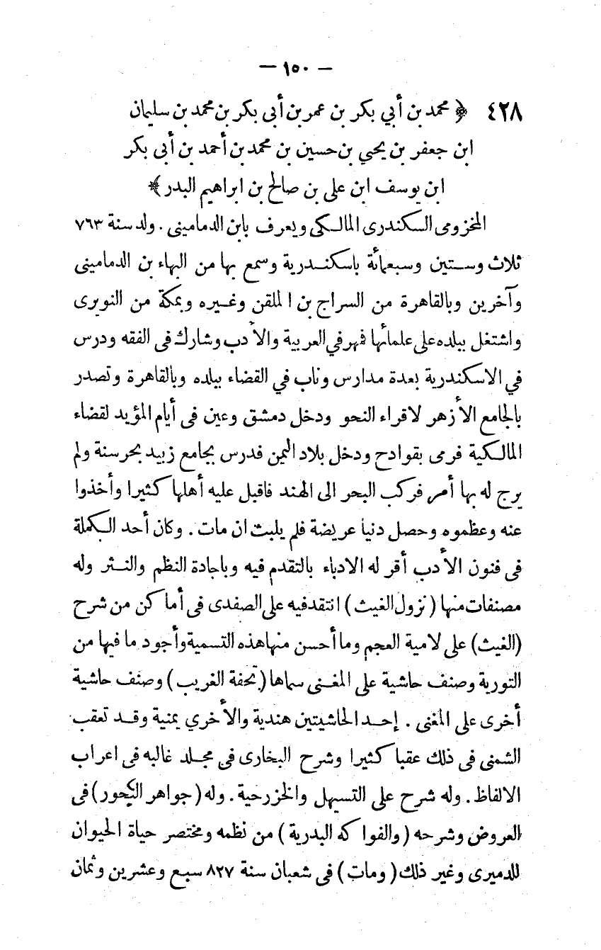 المخزومي السكندري المالكي وَيعرف بِابْن الدماميني ولد سنة 763 ثَلَاث وَسِتِّينَ وَسَبْعمائة بإسكندرية وَسمع بهَا من الْبَهَاء بن الدماميني وَآخَرين وبالقاهرة من السراج بن الملقن وَغَيره وبمكة من النويري واشتغل بِبَلَدِهِ على علمائها فمهر فِي الْعَرَبيَّة وَالْأَدب وشارك فِي الْفِقْه ودرس فِي الْإسْكَنْدَريَّة بعدة مدارس وناب فِي الْقَضَاء بِبَلَدِهِ وبالقاهرة وتصدر بالجامع الْأَزْهَر لإقراء النَّحْو وَدخل دمشق وَعين فِي أَيَّام الْمُؤَيد لقَضَاء الْمَالِكِيَّة فَرمى بقوادح وَدخل بِلَاد الْيمن فدرس بِجَامِع زبيد بَحر سنة وَلم يرج لَهُ بهَا أَمر فَركب الْبَحْر إِلَى الْهِنْد فَأقبل عَلَيْهِ أَهلهَا كثيرا وَأخذُوا عَنهُ وعظموه وَحصل دنيا عريضة فَلم يلبث أن مَاتَ