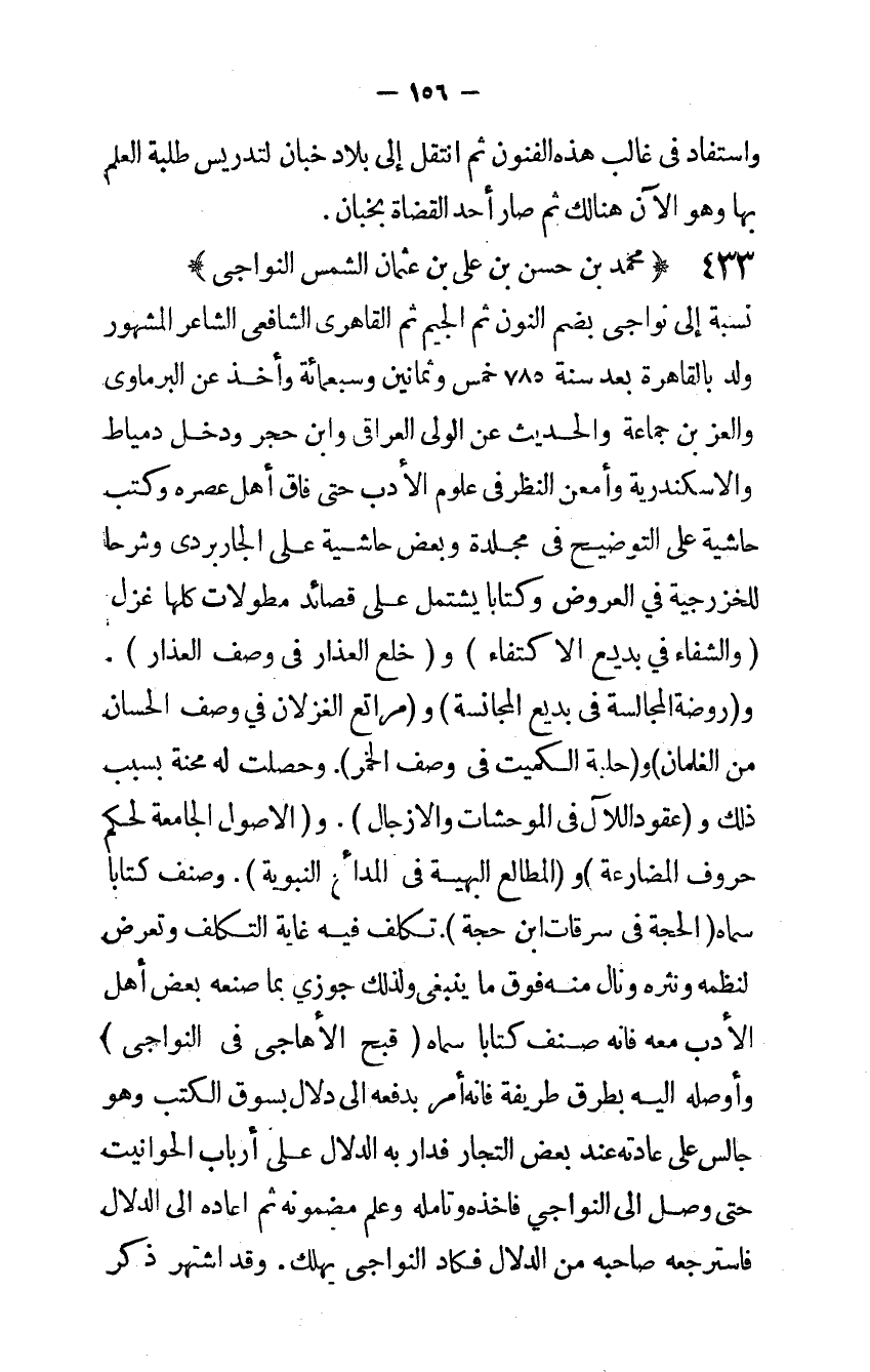 نِسْبَة إِلَى نواجى بِضَم النُّون ثمَّ الْجِيم ثمَّ القاهري الشافعي الشَّاعِر الْمَشْهُور ولد بِالْقَاهِرَةِ بعد سنة 785 خمس وَثَمَانِينَ وَسَبْعمائة وَأخذ عَن البرماوي والعز بن جمَاعَة والْحَدِيث عَن الولي العراقي وَابْن حجر وَدخل دمياط والإسكندرية وأمعن النظر فِي عُلُوم الْأَدَب حَتَّى فاق أهل عصره وَكتب حَاشِيَة على التَّوْضِيح فِي مجلدة وَبَعض حَاشِيَة على الجاربردي وشرحا للخزرجية فِي الْعرُوض وكتابا يشْتَمل على قصائد مطولات كلهَا غزل والشفاء فِي بديع الِاكْتِفَاء وخلع العذار فِي وصف العذار